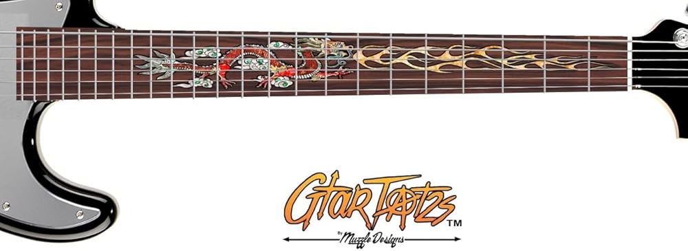 Full cover fretboard Fret*Skinz$. These come in in stock Faux woods. They come in pre-cut squares that fit most any 6 string electric guitar. Never has it been easier to install one of our inlays. Designed to fit up to 24 Fret guitars. Fits most 6 string electric guitars. (Tested on 24.75 & 25.5 scales) These are Printed Vinyl Stickers with a matte lamination. sweat proof, waterproof, fade resistant. Super easy to apply. They won't hinder your playing. They stay put until you decide to pull them off.. Stock Skin Measurments (Millimeters) 1st Fret: 34.150 x 40.427 2nd Fret: 30.968 x 41.441 3rd Fret: 28.956 x 42.395 4th Fret: 26.924 x 43.288 5th Fret: 25.400 x 44.135 6th Fret: 23.876 x 44.937 7th Fret: 22.352 x 45.694 8th Fret: 20.828 x 46.405 9th Fret: 19.558 x 47.079 10th Fret: 18.542 x 47.722 11th Fret: 17.272 x 48.327 12th Fret: 16.002 x 48.895 13th Fret: 14.986 x 49.432 14th Fret: 13.970 x 49.939 15th Fret: 13.208 x 50.423 16th Fret: 11.938 x 50.869 17th Fret: 11.800 x 51.283 18th Fret: 11.262 x 51.689 19th Fret: 9.906 x 52.080 20th Fret: 8.890 x 52.436 21st Fret: 8.382 x 52.777 22nd Fret: 7.620 x 53.094 23rd Fret: 7.112 x 53.397 24th Fret: 6.604 x 53.685 heel: 12.979 x 54.162 (trim to fit if needed) Crafted in America from GtarTat2s Made for Musicians, by Musicians! FITS BASS UP TO 24 FRETS.Quickly turn your boring old guitar into an exotic, custom work of art. Make over your old $100 guitar to look like a $1,000 custom guitar. GtarTat2s won't damage your guitar, effect your guitar sound, or hinder your guitar playing. Made of super thin material that won't get caught in your strings. Takes minutes to apply. If you can use scissors, You can install GtarTat2s. GtarTat2s stay on until you decide to pull them off. Dot Eraser! GtarTat2s inlay is designed to cover your dot inlay. This inlay gives the illusion you have custom inlay. Unlike real inlay, you can change GtarTat2s with a different design anytime you want to refresh the look of your guitar.