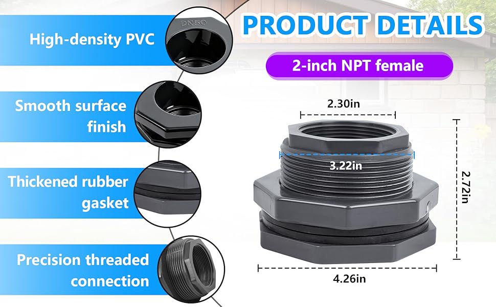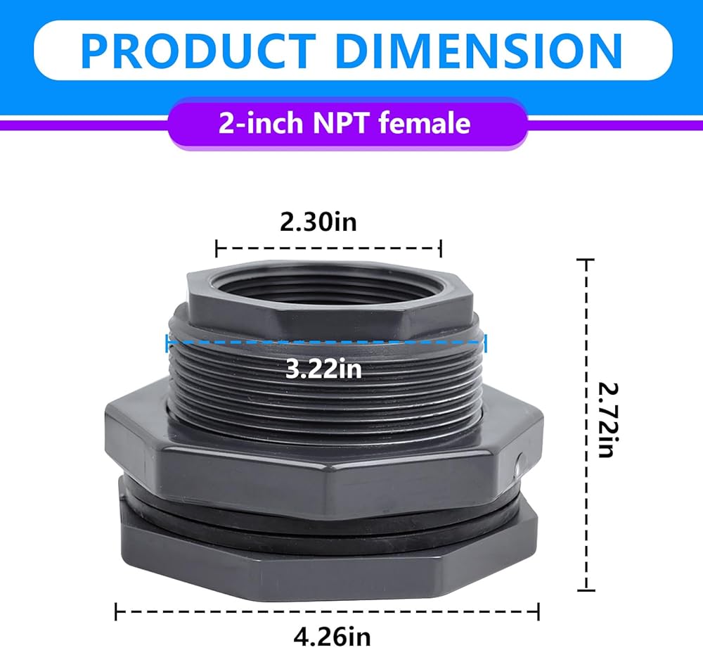 مواصفات المنتج: يبلغ طول تركيب الحاجز PVC مقاس 2 بوصة 7.96 سم (3.13 بوصة) في الطول الإجمالي. يبلغ قطر الخيط الخارجي 8.3 سم (3.27 بوصة)، بينما يبلغ قطر الخيط الداخلي 5.7 سم (2.23 بوصة). لقد تم تصميمه ليناسب الأطراف الذكورية القياسية مقاس 2 بوصة NPT، مما يتيح اتصالات بسيطة وفعالة ومانعة للتسرب