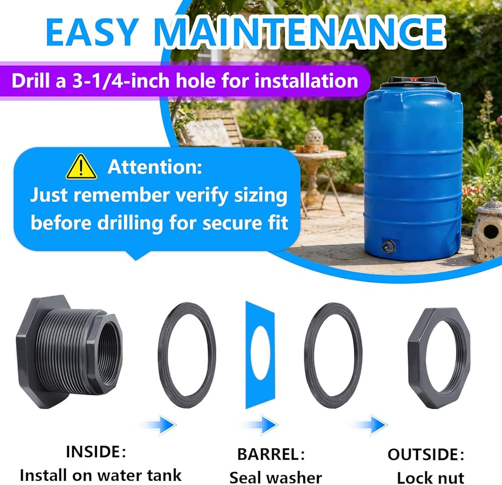 تركيب سهل: للتركيب، قم بثقب فتحة مقاس 3-1/4 بوصة عبر جدار الخزان، ثم قم بتجميع الجزء المناسب من موصل الخرطوم. نوصي بالتأكد من جميع الأبعاد مسبقًا لضمان الملاءمة المناسبة لاتصال مانع للتسرب