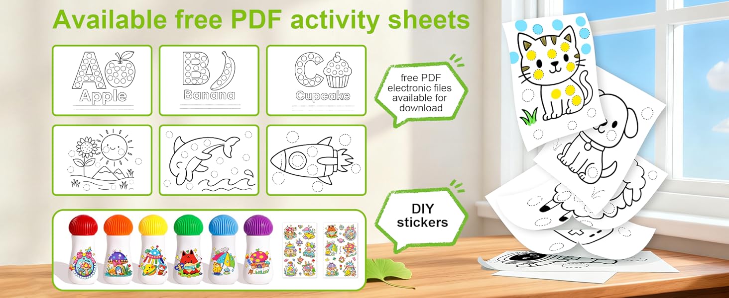 ✅ آمنة على الأطفال وجاهزة للحرف اليدوية: أقلام تحديد منقطة صديقة للأطفال مع طرف منقط كبير مقاس 0.71 بوصة / 1.8 سم يسهل التحكم فيه. تتضمن أوراق ملصقات ممتعة لإلهام المزيد من أفكار الرسم النقطي والمشاهد الإبداعية.