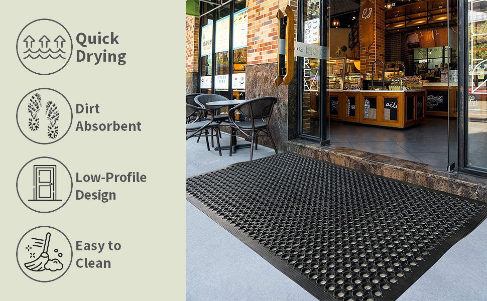 سجادة أرضية مطاطية شديدة التحمل للاستخدام الخارجي - مصممة لتكون قوية ومتينة مع فتحات تصريف للمياه والثلج والملح والطين، ويمكن استخدام هذه السجادة المطاطية جيدة الصنع كسجادة مطعم، أو سجادة مطبخ، أو سجادة أمان، أو سجادة صالة الألعاب الرياضية، أو حتى سجادة بار.