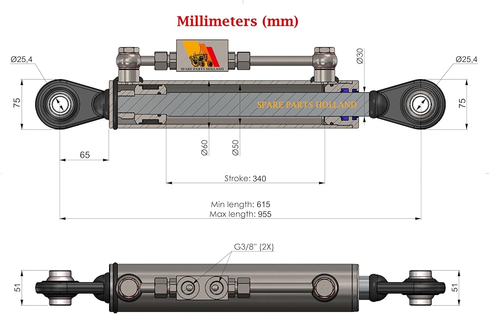 Scope of Delivery 1 × Hydraulic Top Link (black powder-coated) 2 × Hydraulic hoses (27.5") 2 × 1/2" BSP quick couplers (poppet type, ISO 5675 – Series A)