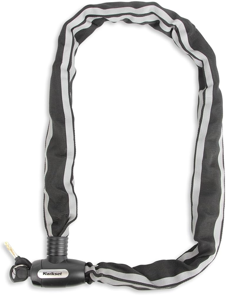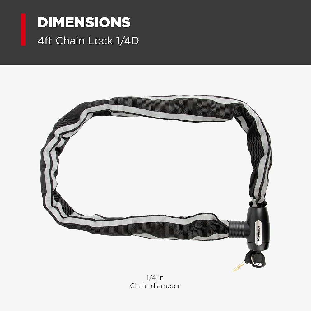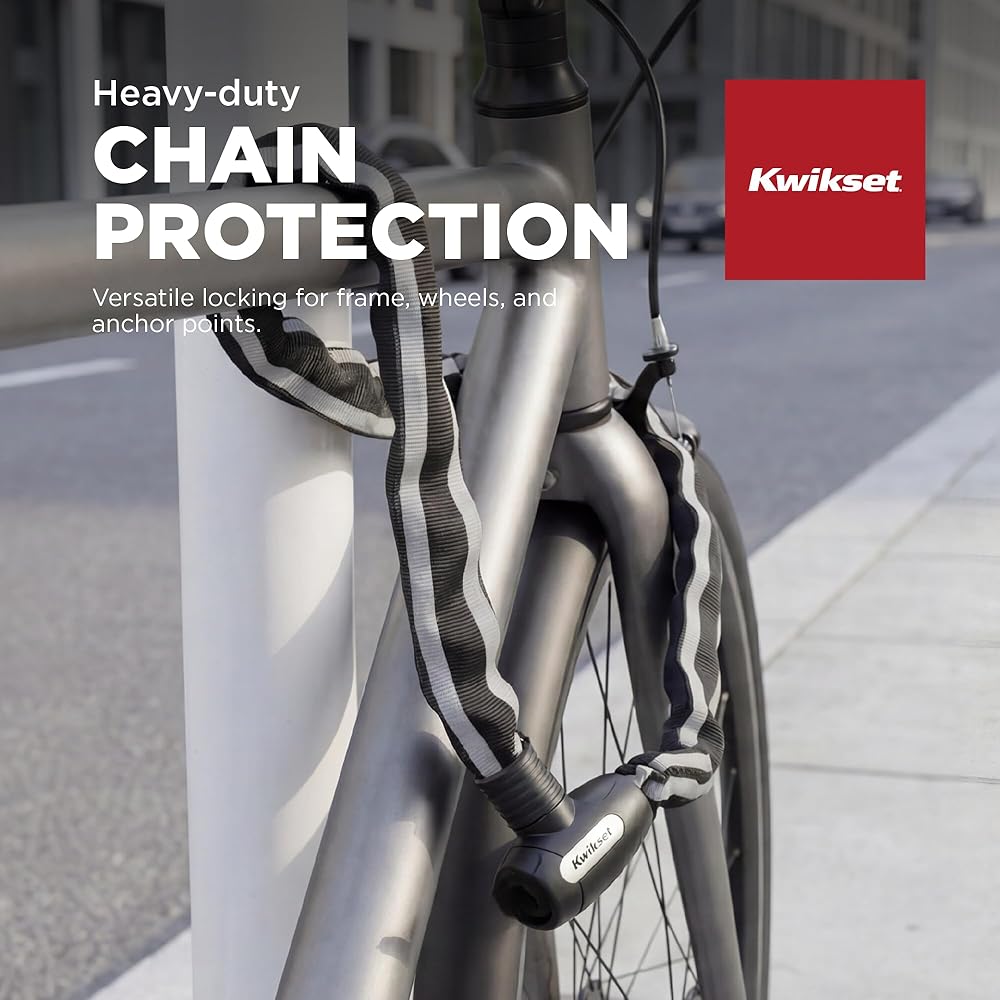 Kwikset Bicycle Chain Locks offer flexible, adjustable security for bikes, scooters, strollers, and outdoor gear. The 4 ft chain conforms to racks, posts, and irregular lock-up points where rigid locks won't reach, and the 4-digit combination dial eliminates the need to carry keys. Built for routine outdoor exposure with a coating that protects bike frames from scratches, it is simple, dependable, and versatile. Backed by a Limited Lifetime Warranty.