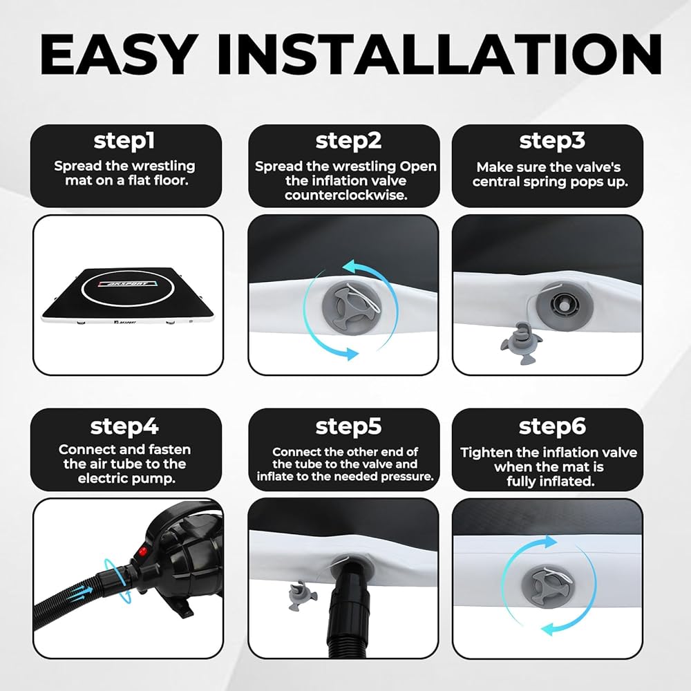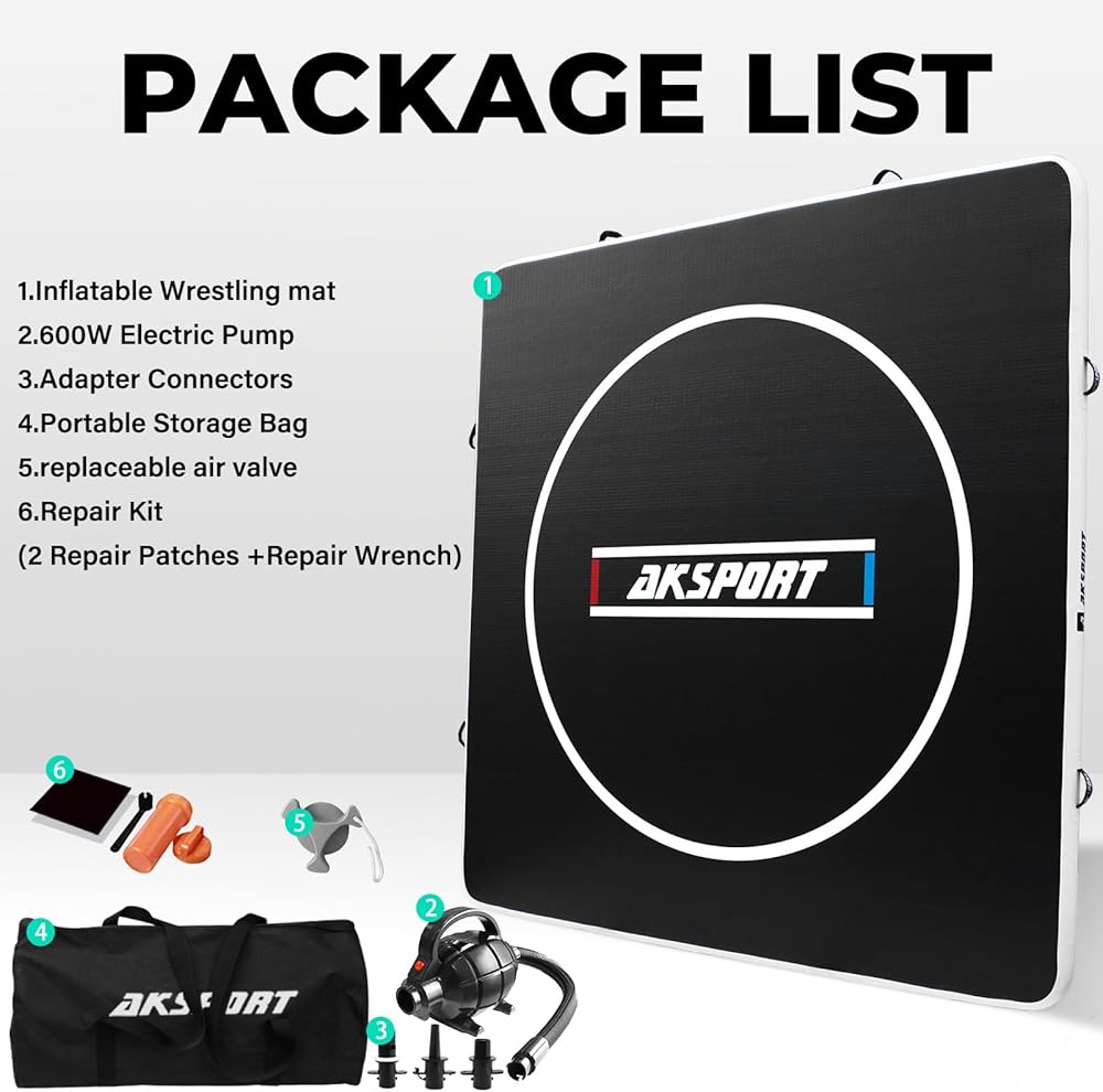 【مجموعة كاملة من الملحقات】: تشتمل مجموعة بساط المصارعة مقاس 10 × 10 أقدام على بساط مصارعة قابل للنفخ، ومضخة هواء 1 × 600 وات، و3 محولات مضخة هواء، و1 × حقيبة حمل، و1 × صمام هواء احتياطي، و2 × رقع إصلاح، و1 × مفتاح ربط، و1 × دليل تعليمات، مما يوفر حلاً متكاملاً لاحتياجاتك.