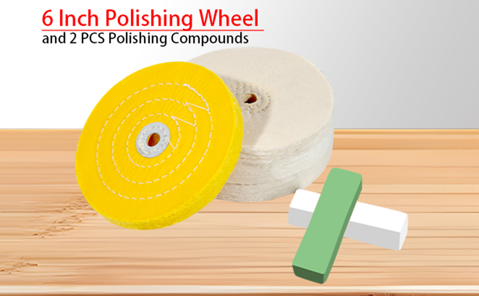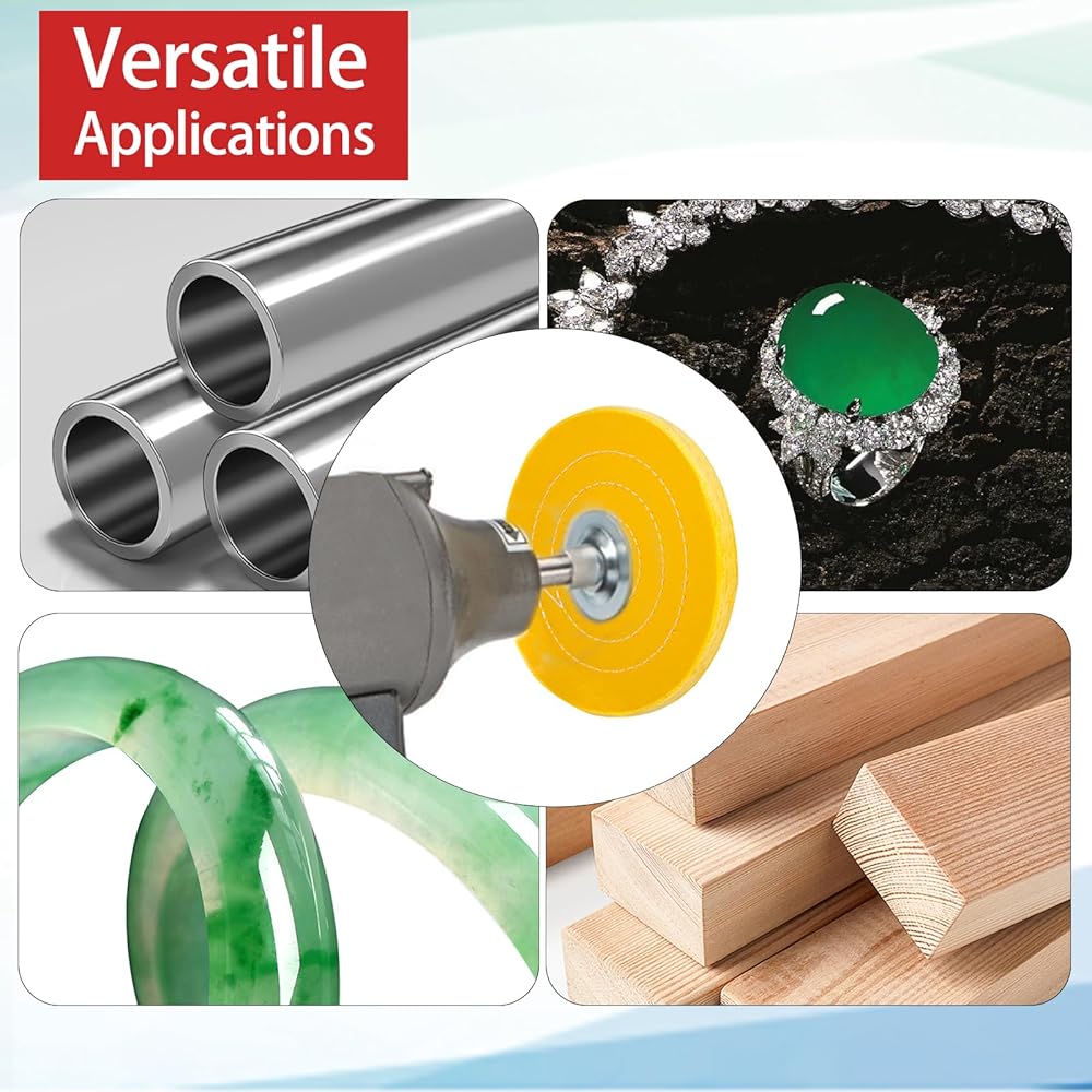 مجموعة عجلات تلميع تلميع مقاس 6 بوصات: تتضمن عجلة صفراء 1 × 50 طبقة (صلابة متوسطة)، وعجلات بيضاء 2 × 70 طبقة (لمسة نهائية أكثر نعومة)، وعجلة فلانيل فضفاضة 1 × 30 طبقة (مرنة للأعمال الدقيقة).