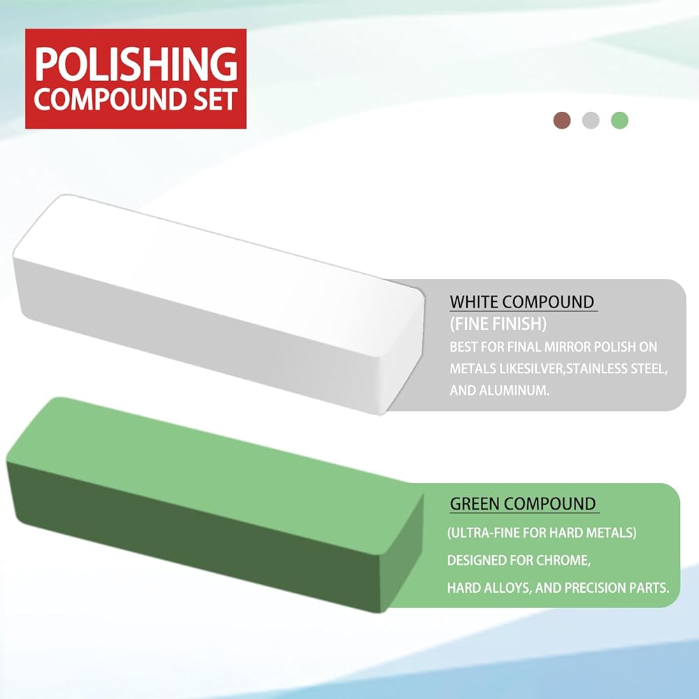مجموعة مركبات التلميع المكونة من قطعتين: تحتوي على 1x مركب تلميع أبيض (لمسة نهائية دقيقة) و1x مركب أخضر (فائقة النعومة للمعادن الصلبة).