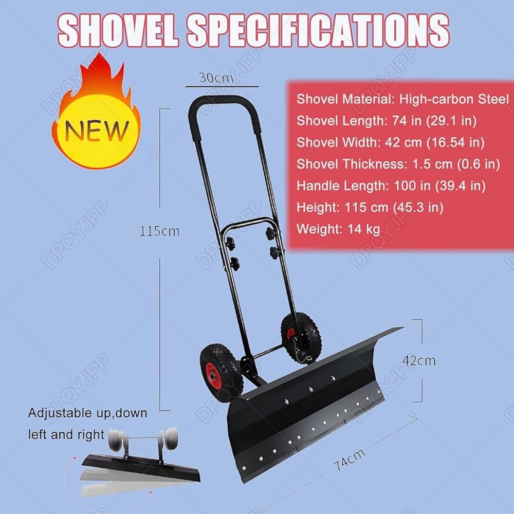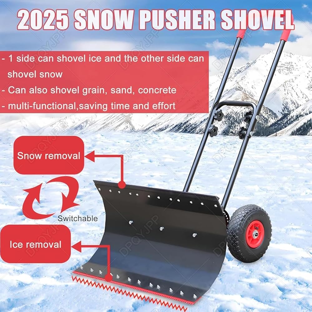 • New push snow shovel with wheels uses upgraded double rod design,one side features a wide 42cm(16.54in) pusher for efficient snow removal, while the reverse side has sharp ice teeth to break through hardened ice.