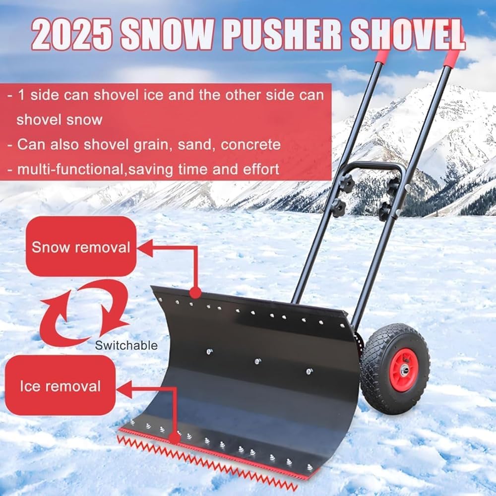 Snow Shovel & Ice Shovel:Push snow shovel with wheels uses upgraded double rod design,one side features a wide 42cm(16.54in) pusher for efficient snow removal, while the reverse side has sharp ice teeth to break through hardened ice.