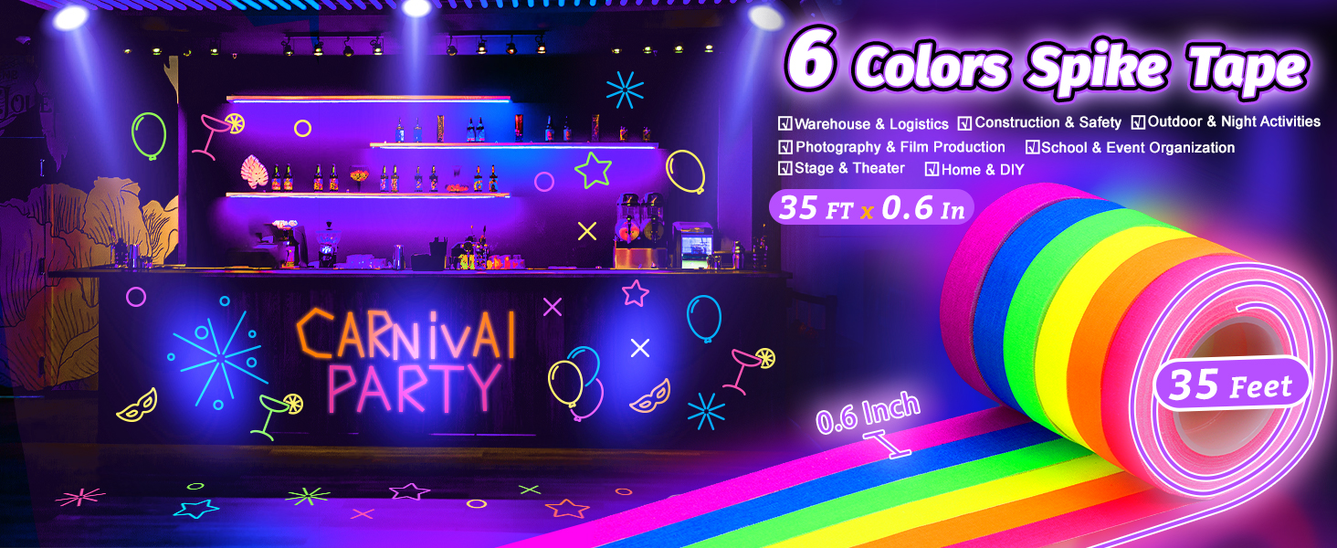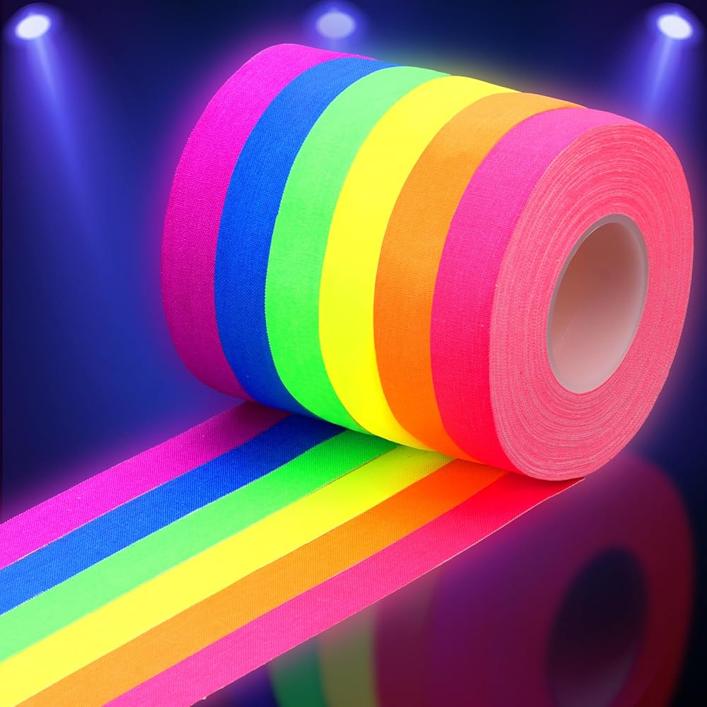شريط قماشي من 6 لفات نيون غافر: يتميز بـ 6 ألوان نيون عالية الوضوح (الوردي والأخضر والأصفر والبرتقالي والأزرق والأرجواني). الشريط المدبب لا يتوهج من تلقاء نفسه، فهو يتطلب التعرض للأشعة فوق البنفسجية/الضوء الأسود ليكشف عن سطوعه، مما يجعله مثاليًا لحفلات الأشعة فوق البنفسجية، والحفلات المتوهجة، ووضع علامات على المسرح، والحرف اليدوية اليدوية.