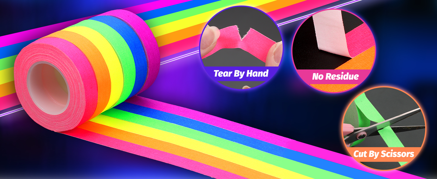 شريط ملون نيون لا يترك بقايا: مصنوع من مادة قماش قطنية متينة تعمل بالأشعة فوق البنفسجية، يلتصق هذا الشريط اللاصق القوي بمعظم الأسطح ولكنه يمكن إزالته دون ترك بقايا لزجة. سطحه القابل للكتابة يسمح باستخدام العديد من الأقلام أو أقلام التحديد أو قلم الجل ويمكنك تمزيقه باليد دون عناء