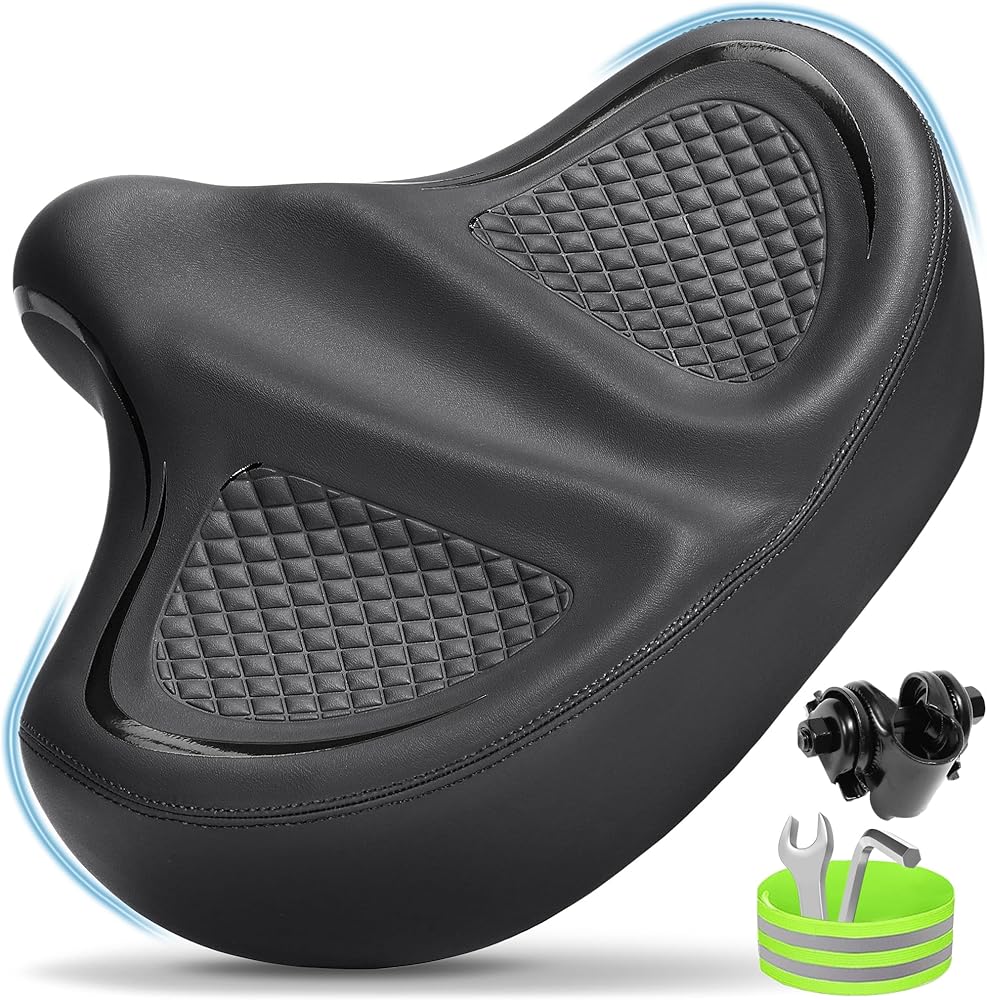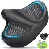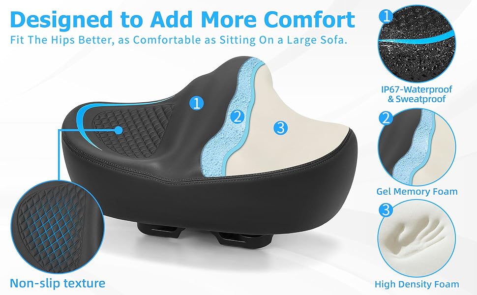 • Get A Large & Soft Bike Seat: Extra-wide design, cushy padding. It measures 12 * 13 * 5.5 inches, 2.56 inches thick high-density foam provides soft support, which can fully meet your comfort needs for wide seats
