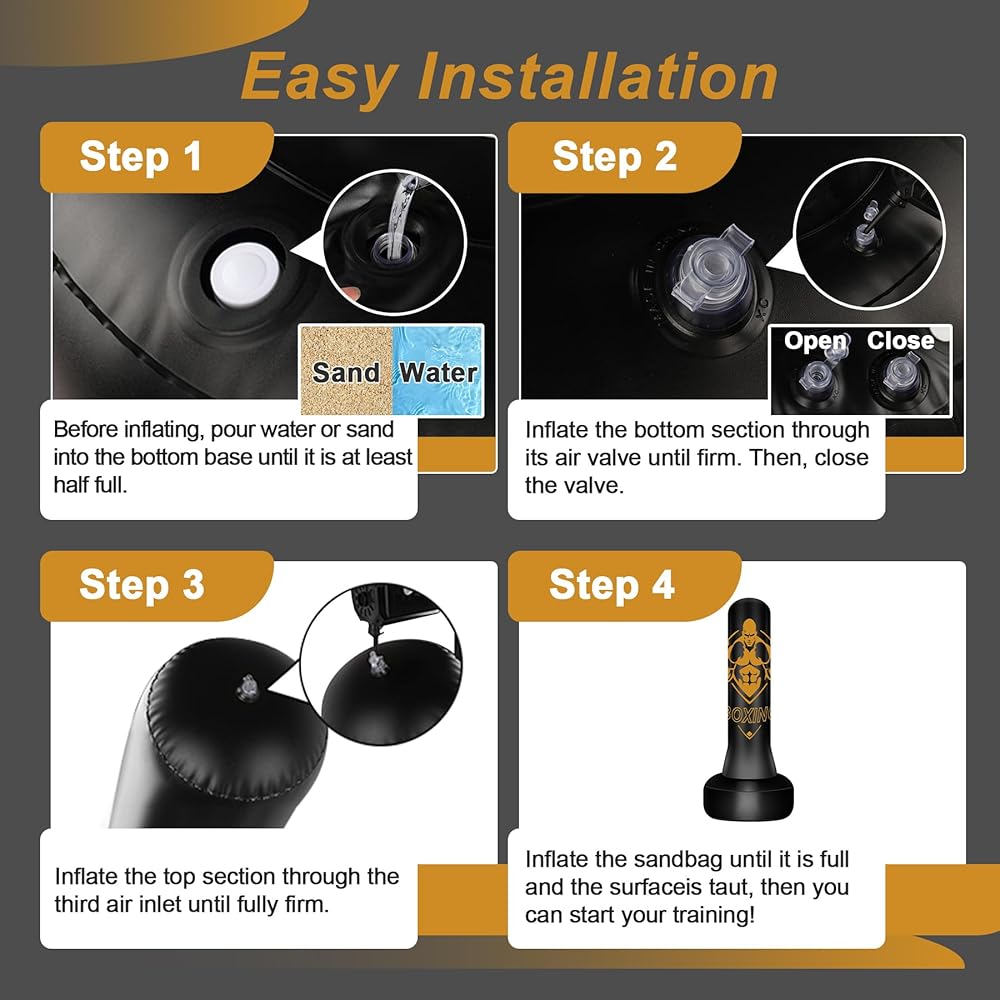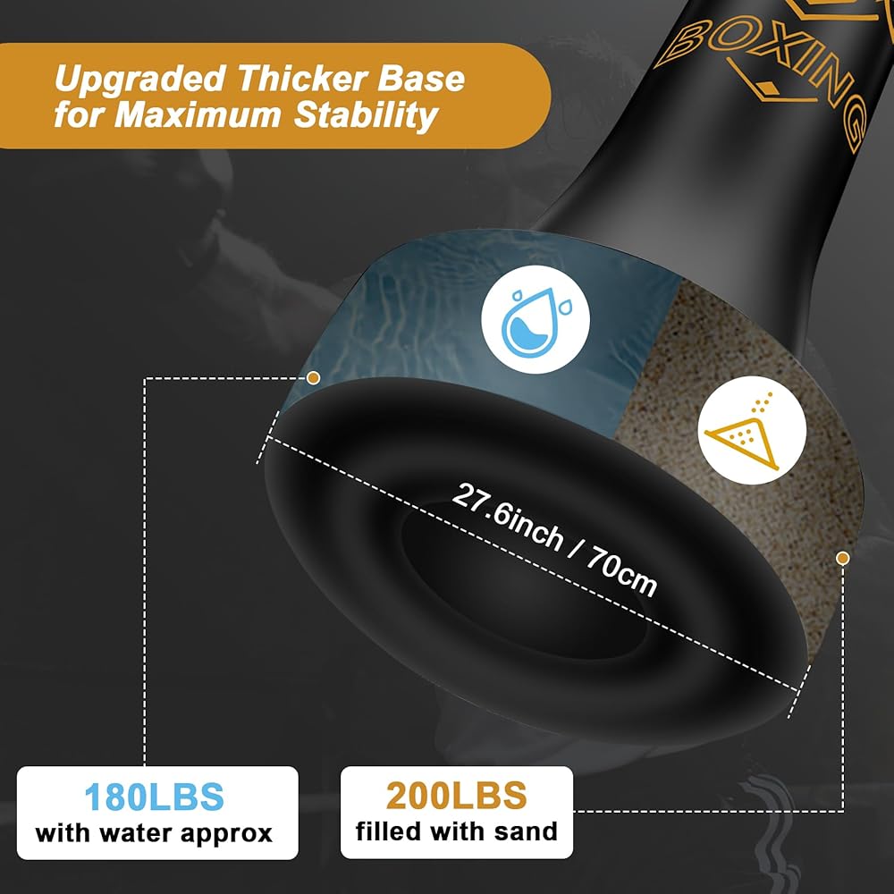 Stable Base with Heavy Bag Stand: Our punching bag stand is built for stability with a 27.6" widened base. Fill with water (180 lbs) or sand (200 lbs), or both, and this heavy bag stand stays steady under powerful strikes. Easy to inflate with the included pump, it transforms any room into your personal training space within minutes