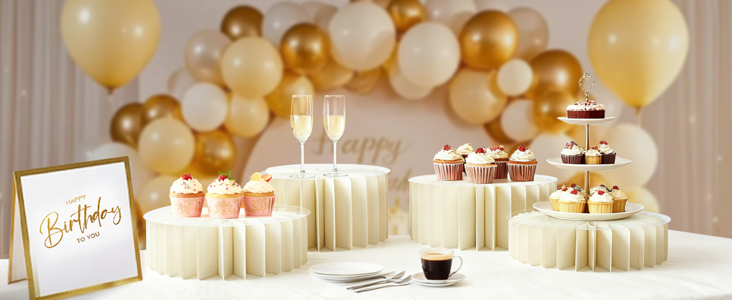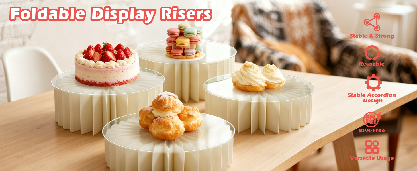متينة ومستقرة: مصنوعة من الورق المقوى عالي الكثافة مع ألواح PVC الشفافة السميكة، تتحمل رافعات البوفيه هذه ما يزيد عن 100 رطل دون انقلاب أو طي. تضيف رافعات العرض الأنيقة والعملية لمسة عصرية إلى أي طاولة حلوى، وهي مثالية لحفلات الزفاف والحفلات والتجمعات العائلية وحفلات استقبال الأطفال.