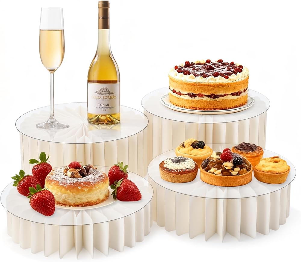 مجموعة عرض متعددة الاستخدامات: تتضمن 4 منصات عرض بارتفاعات مختلفة (11.8 بوصة × 5.9 بوصة، 11.8 بوصة × 4.9 بوصة، 11.8 بوصة × 3.9 بوصة، 11.8 بوصة × 2.9 بوصة). يمكنك مزجها ومطابقتها بسهولة لإنشاء حاملات طعام ذات طبقات ترفع مستوى الحلوى أو طاولة البوفيه على الفور.