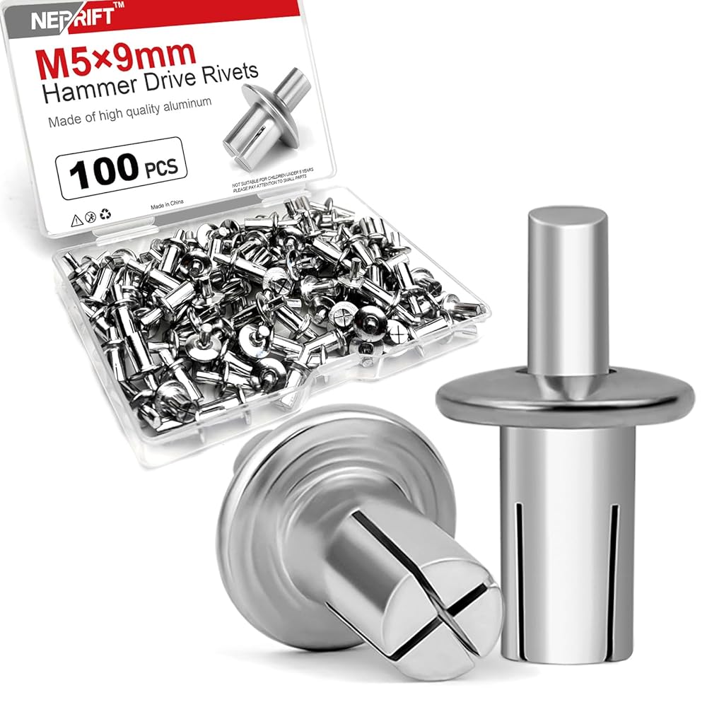 [Sufficient quantity]: This drive rivets includes 100Pcs M5 x 9mm hammer drive rivets, providing ample quantity for DIY projects, repairs, and professional installations. The precise size ensures perfect compatibility with light-duty fastening needs.