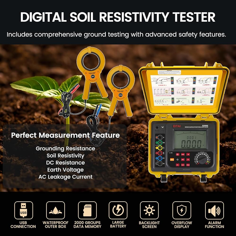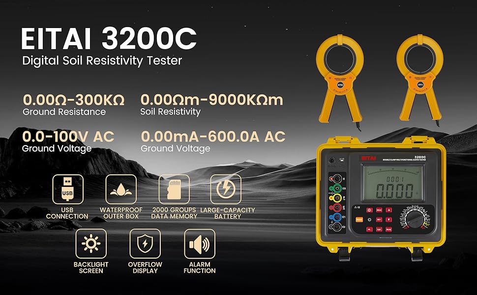 EITAI3200C اختبار مقاومة التربة، Φ70mm، 0.00Ω-300KΩ، 0.00Ωm-9000kΩm، AC 0-100.0V، 600A، مبيعات الشركة المصنعة المباشرة، المشابك المزدوجة جهاز قياس مقاومة الأرض الأرضية
