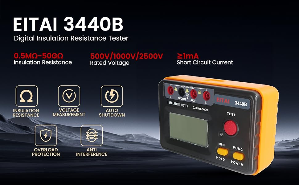 【دقة عالية】يوفر مقياس مقاومة العزل EITAI3440B ما يصل إلى 2500 فولت مع تيار دائرة قصر ≥1mA لاختبار مستقر وموثوق. القدرة على التكيف والاتساق العالي لإعادة الاختبار.