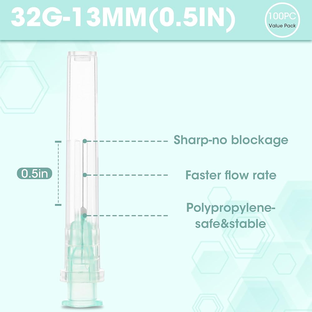 100 Pack 32G 0.5 inch Needle, Individually Wrapped per box. Each dispensing tip is individually blister-sealed with a protective cap, ensuring hygiene and safe storage