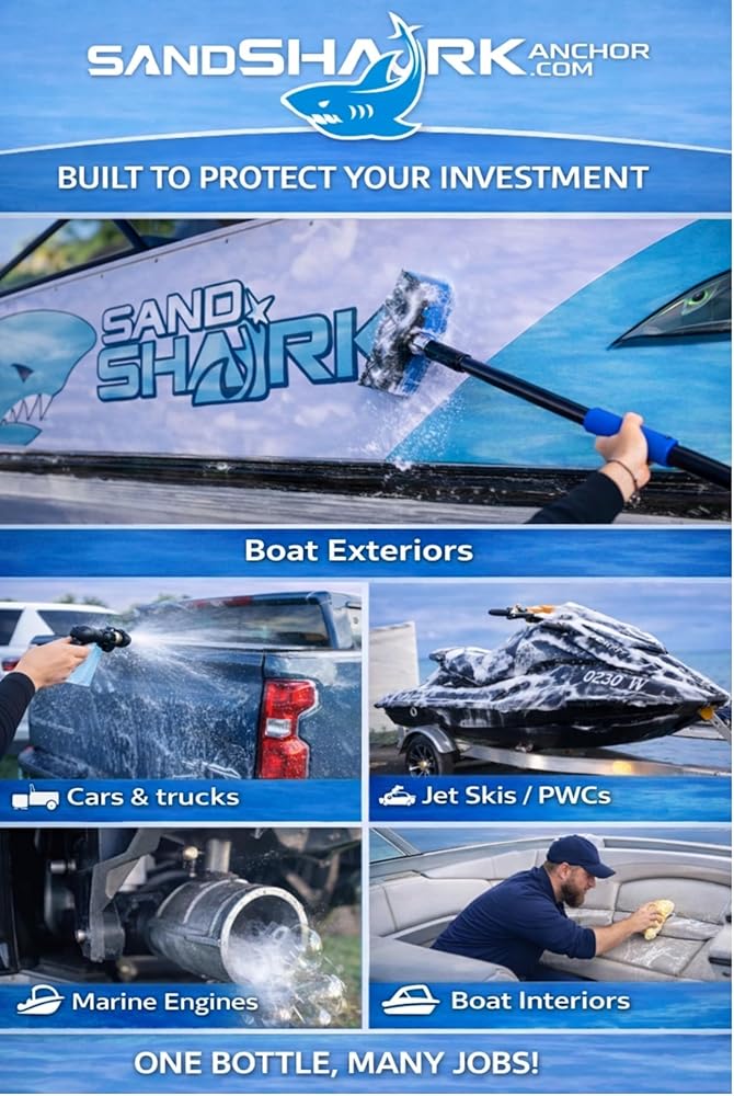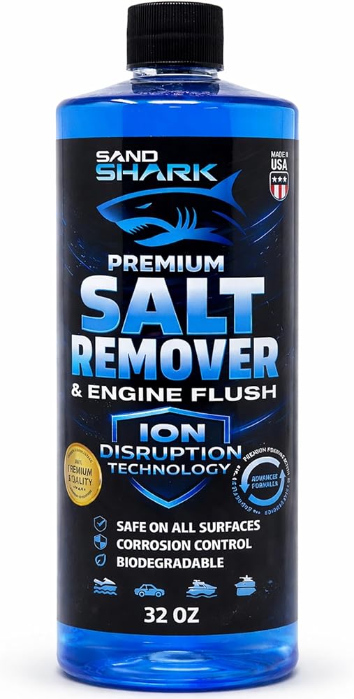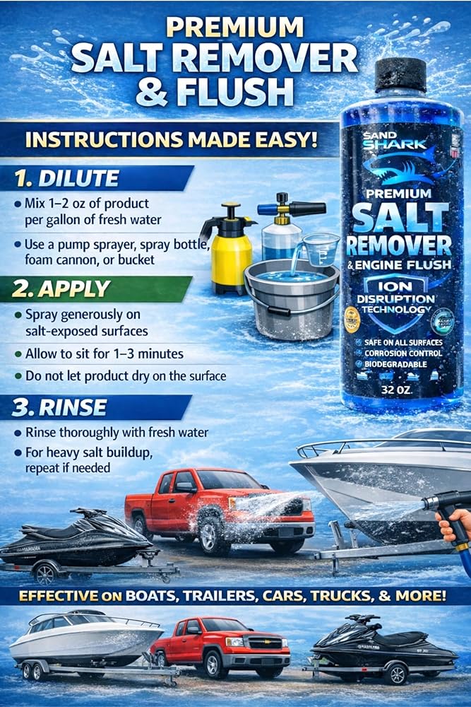 SandShark 2-in-1 Salt Remover & Engine Flush is a versatile cleaning solution designed for marine and powersports owners who want a simple way to rinse away salt and mineral residue after use. This pH-balanced formula can be used as an exterior wash to help remove salt from boat hulls, decks, and components, or as an engine flush to help rinse cooling systems after saltwater operation when used according to manufacturer instructions. Safe for use on common marine surfaces including fiberglass, aluminum, aluminum components, paint, rubber, plastics, and glass, SandShark is formulated to clean effectively without harsh chemicals or abrasives. The advanced formula also helps reduce mineral residue and water spotting during rinsing, making regular maintenance faster and more convenient. Ideal for boats, jet skis, PWCs, trailers, and other outdoor equipment, SandShark helps keep surfaces clean and ready for the next outing.