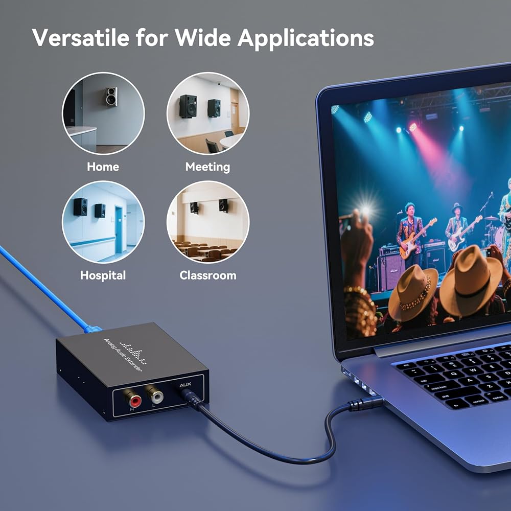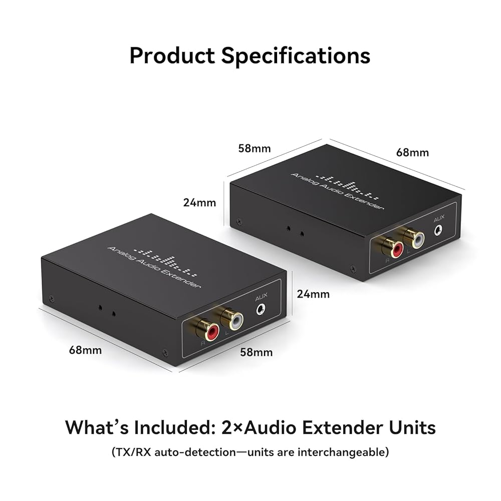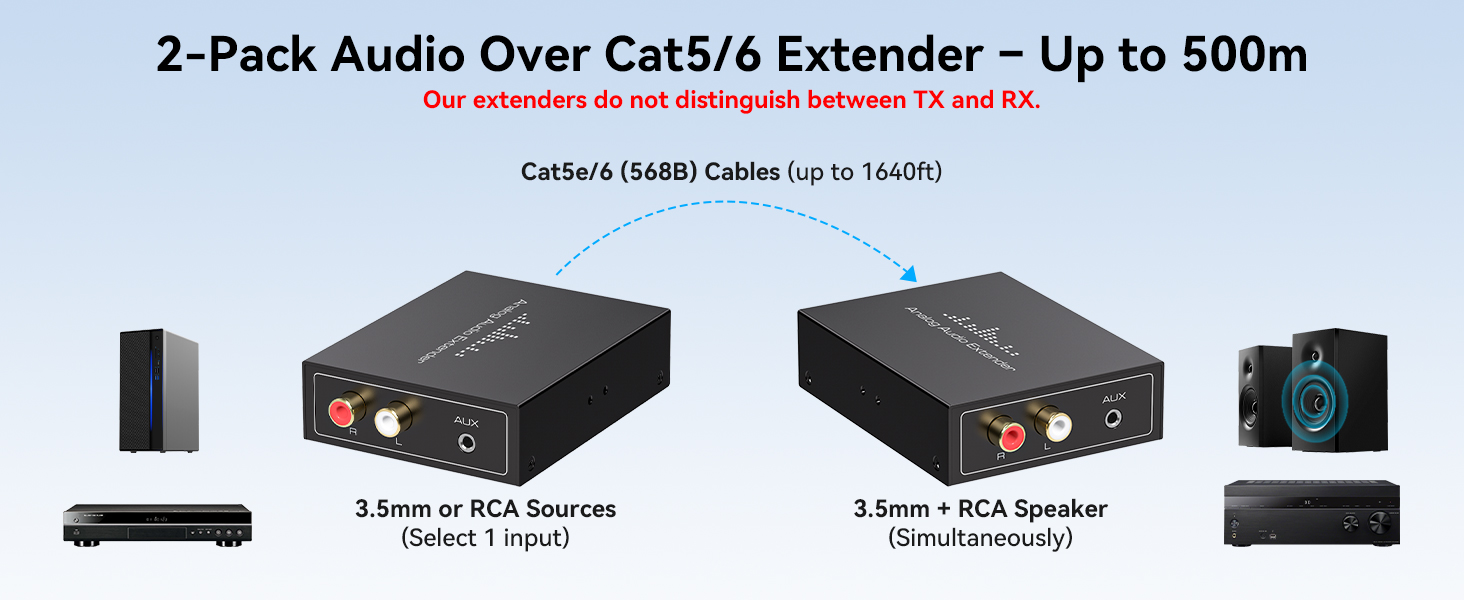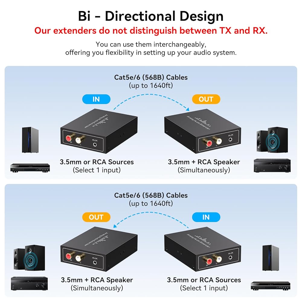 【لا يلزم وجود تمييز بين جهاز الإرسال/المستقبل】يزيل موسع الصوت العالمي هذا الحاجة إلى التفريق بين وحدات الإرسال والاستقبال. ما عليك سوى توصيل مصدر الصوت الخاص بك بأحد الأجهزة باستخدام كابل RCA (L+R) أو 3.5 مم، والاتصال بجهاز آخر باستخدام كابل Cat5e/6 Ethernet، وتوجيه الإخراج إلى مكبرات الصوت أو مكبرات الصوت الخاصة بك