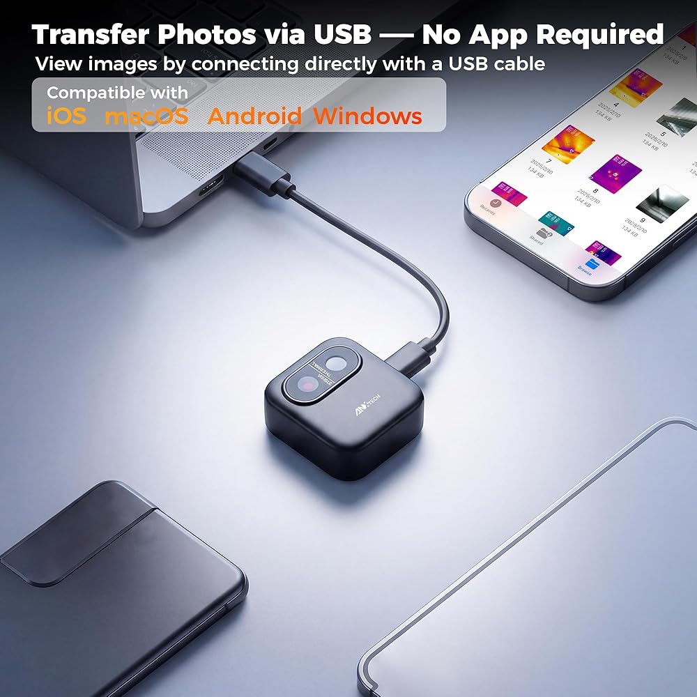 صغيرة الحجم ومحمولة: تزن هذه الكاميرا الحرارية الصغيرة 1.4 أونصة (40 جم) فقط، ويمكن وضعها بسهولة في جيبك أو حقيبة ظهرك. مثالي للتخييم والسفر، فهو يساعدك على اكتشاف الحياة البرية حول خيمتك ليلاً أو فحص غرف الفندق بحثًا عن مصادر حرارة غير عادية - مما يمنحك المزيد من الوعي وراحة البال أينما تقيم.