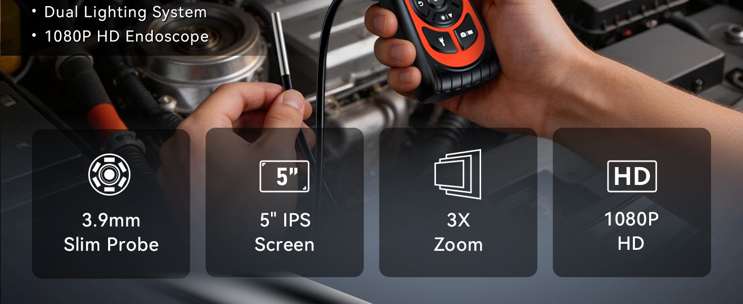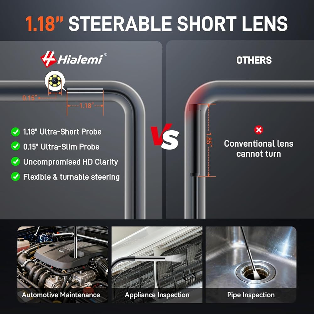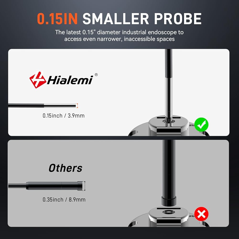【مسبار رفيع للغاية 3.9 مم للوصول الضيق】احتل المساحات الضيقة باستخدام مسبار كاميرا بوريسكوب فائق النحافة 3.9 مم (0.15 بوصة)، وهو أرق بنسبة 51% تقريبًا من العديد من الموديلات القياسية 8 مم. يوفر هذا التصميم الرفيع للغاية، المقترن بعدسة قصيرة مقاس 1.18 بوصة، قدرة فائقة على المناورة والوصول إلى المناطق التي لم يكن من الممكن الوصول إليها سابقًا، مثل فتحات قابس شرارة السيارات والآلات المعقدة والأنابيب الضيقة - مما يوفر لك الوقت والجهد في عمليات التفتيش.