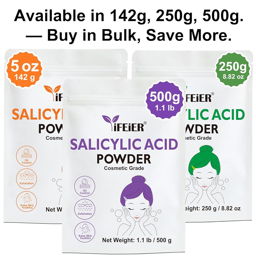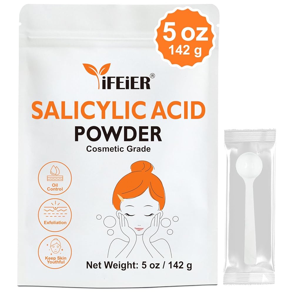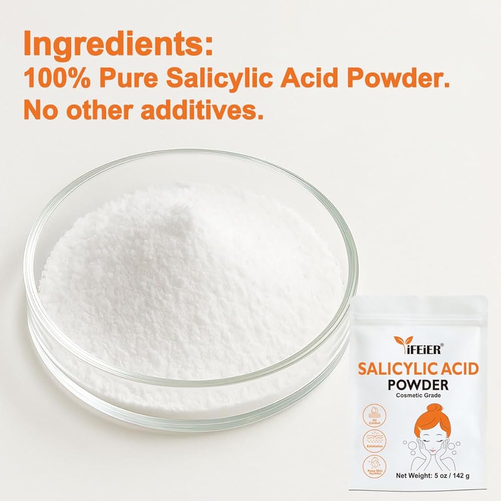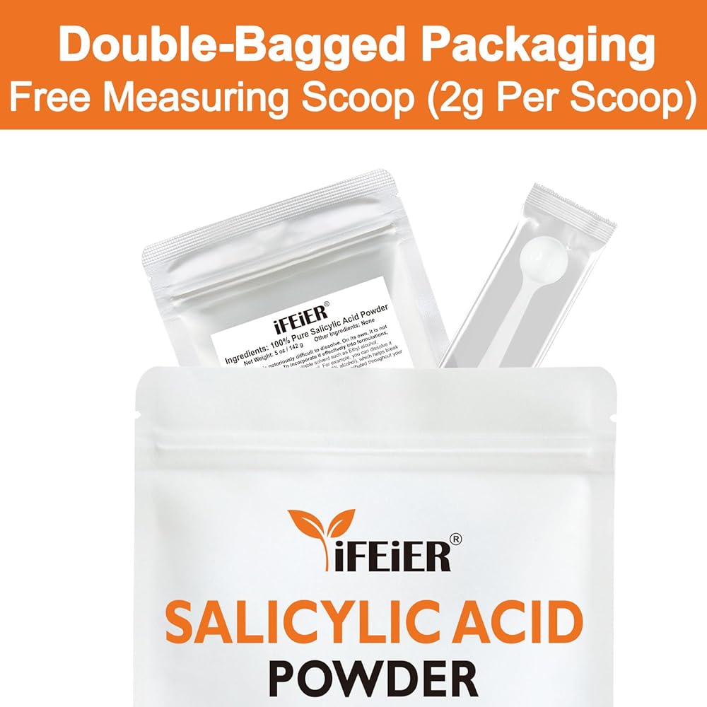 درجة نقاء عالية وأمان - مسحوق حمض الساليسيليك بدرجة مستحضرات التجميل من iFEiER بنقاء 100%، بدون مواد مالئة أو مواد غش، 5 أونصة (142 جم). تم إنتاجها واختبارها لضمان الجودة والسلامة المتسقة.