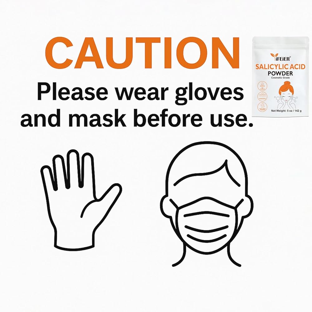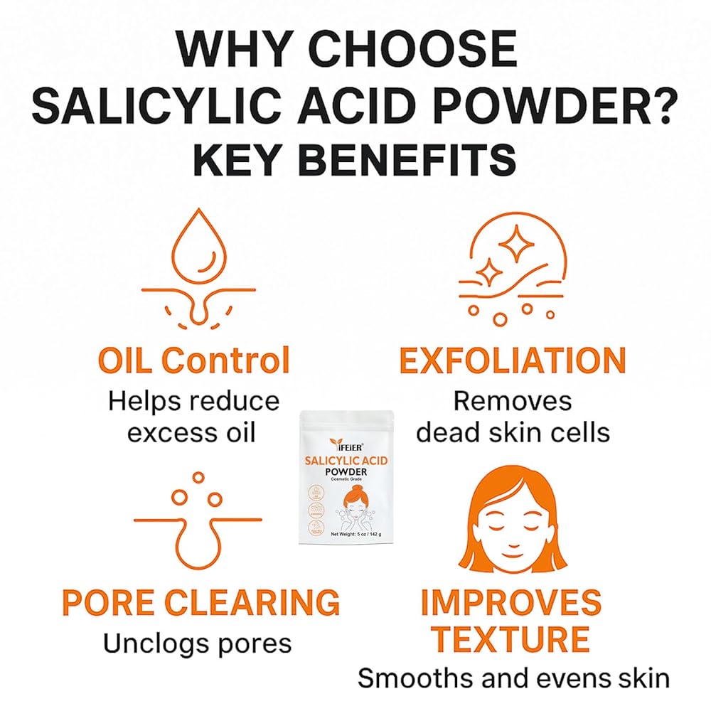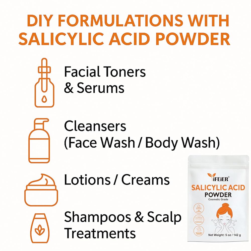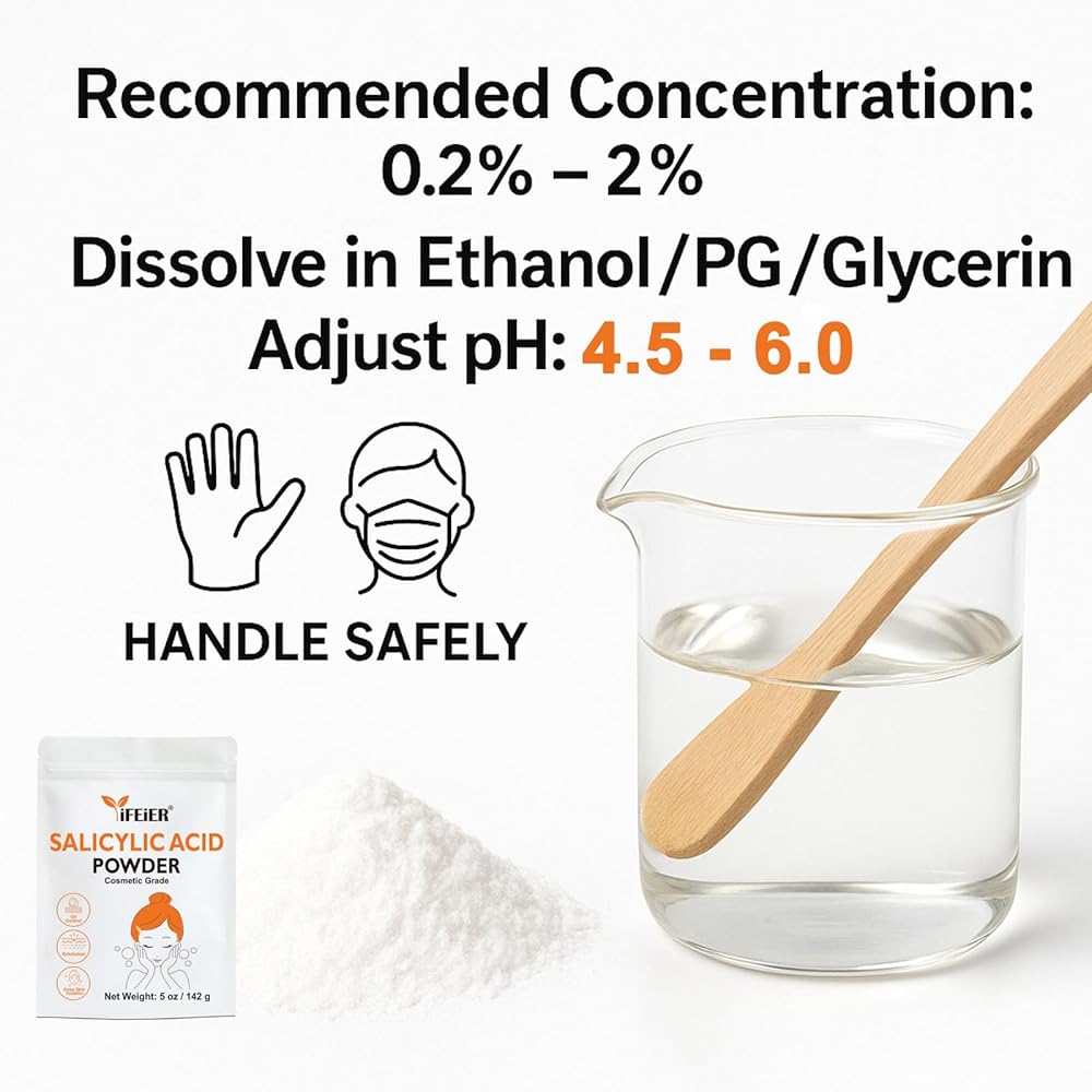 درجة نقاء عالية وأمان - مسحوق حمض الساليسيليك بدرجة مستحضرات التجميل من iFEiER بنقاء 100%، بدون مواد مالئة أو مواد غش، 5 أونصة (142 جم). تم إنتاجها واختبارها لضمان الجودة والسلامة المتسقة.