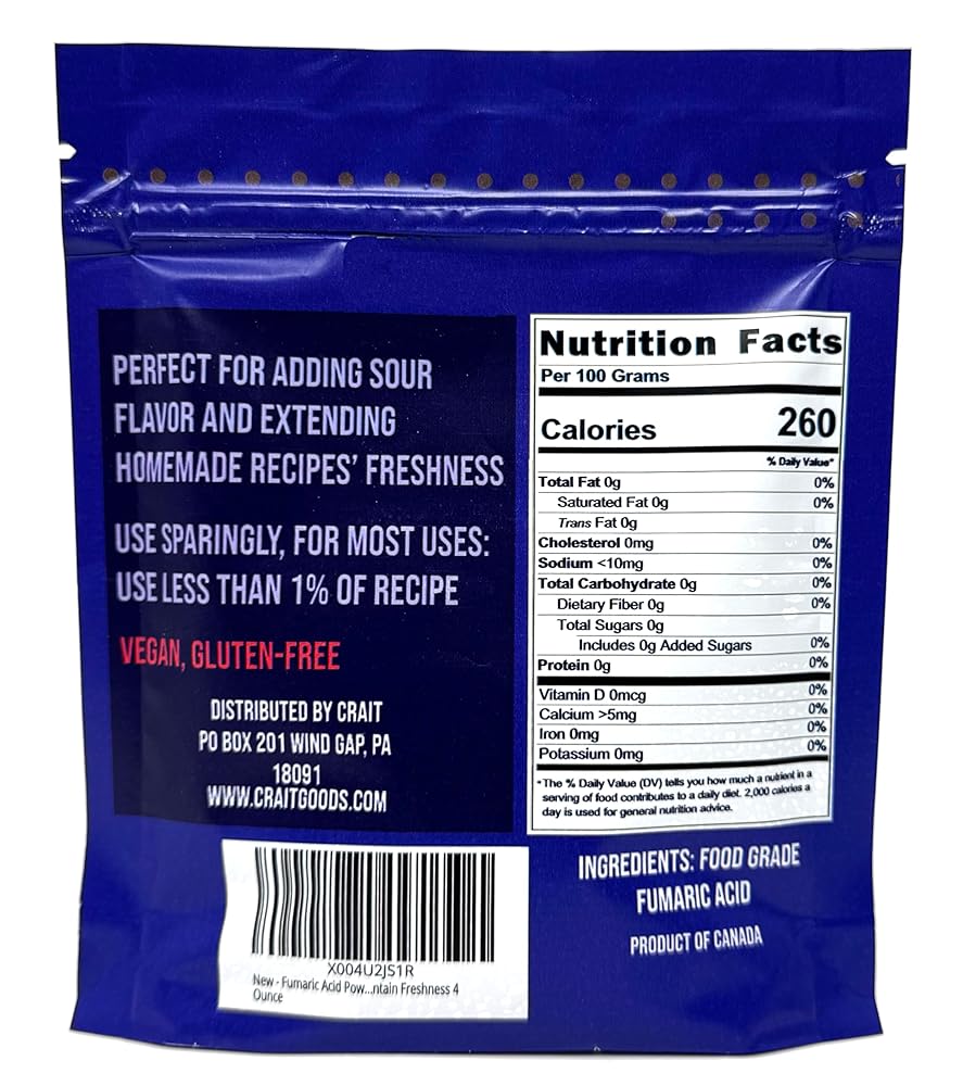 - درجة الغذاء ونقي طازج - حمض الفوماريك في كيس قابل للإغلاق بوزن 118 مل مما يبقيه نظيفًا وجاهزًا للاستخدام.
