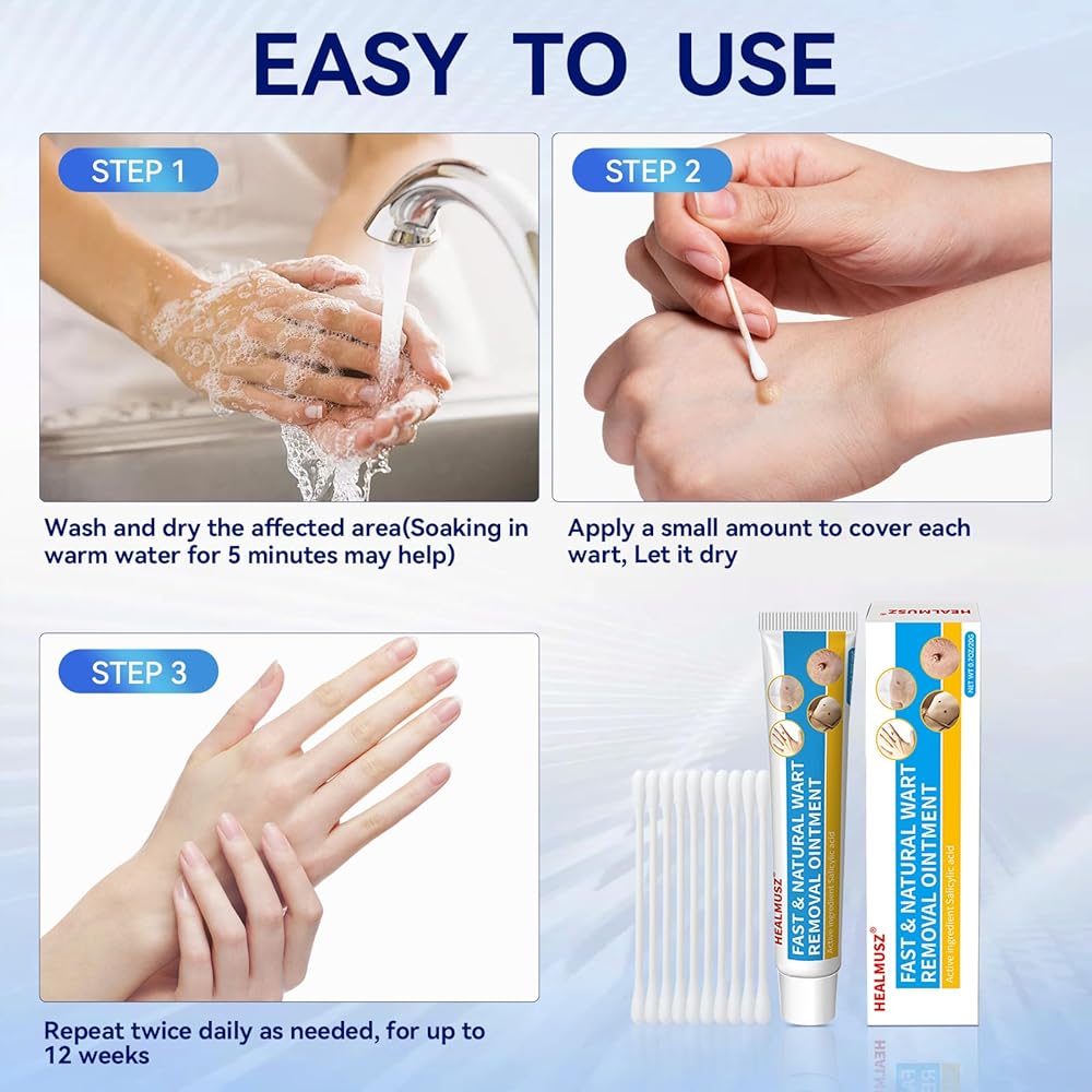 • [سهل الاستخدام]: كريم إزالة الثآليل سهل الاستخدام. نظفي المنطقة المصابة قبل الاستخدام، وجففيها جيدًا، وضعي كمية صغيرة على الثؤلول. السماح ليجف. كرر ذلك مرتين يوميًا حسب الحاجة لمدة تصل إلى 12 أسبوعًا