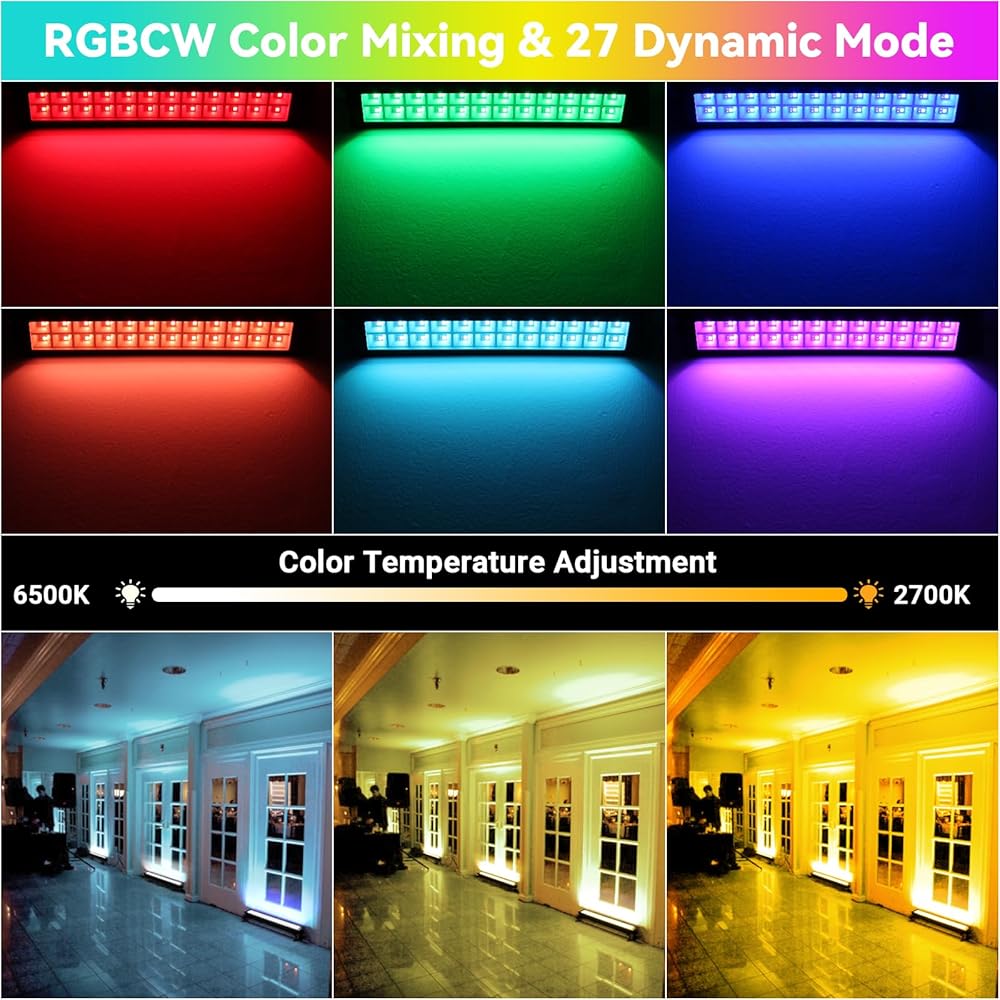 48W RGBCW WASH LIGHT BAR - يتميز شريط ضوء الغسيل LED هذا بـ RGB ممزوجًا باللون الأبيض البارد والأبيض الدافئ، ويوفر 16 مليون لون و27 وضعًا لتأثير الإضاءة الديناميكي. يمكنك بسهولة إنشاء تأثيرات إضاءة مخصصة من خلال اختيار اللون ودرجة حرارة اللون القابلة للتعديل (2700 كلفن - 6500 كلفن) والتحكم في السطوع. يوفر مصباح الغسيل LED هذا مجموعة واسعة من تأثيرات الإضاءة الساطعة، مما يجعله مثاليًا للواجهات المعمارية الصغيرة بالإضافة إلى تطبيقات الإضاءة المعمارية الداخلية والخارجية.