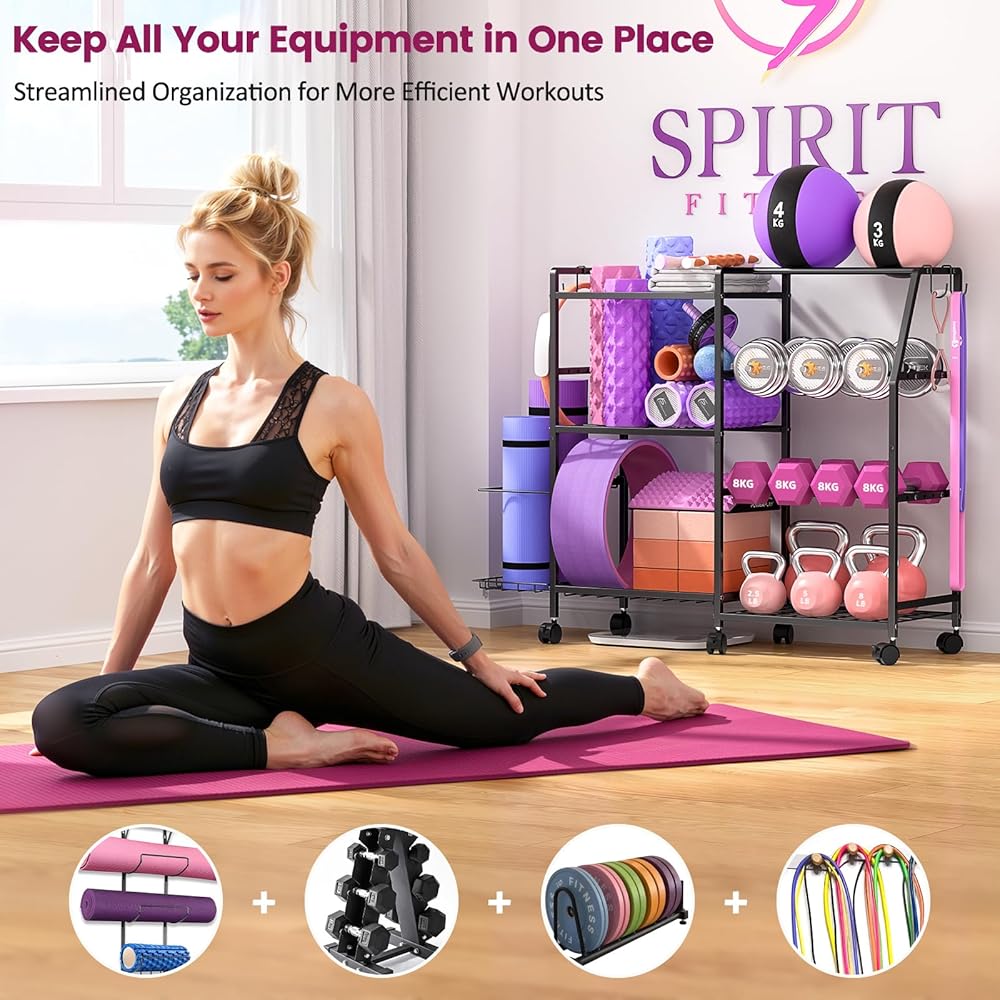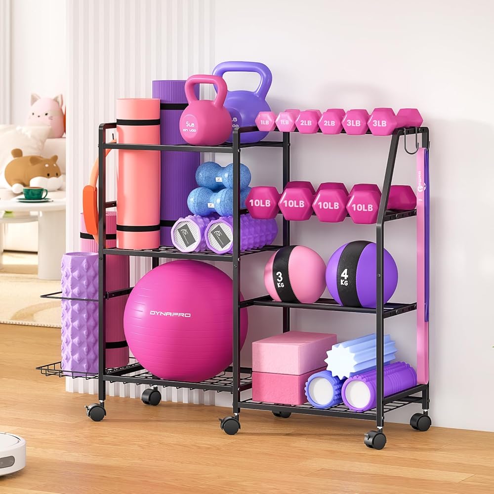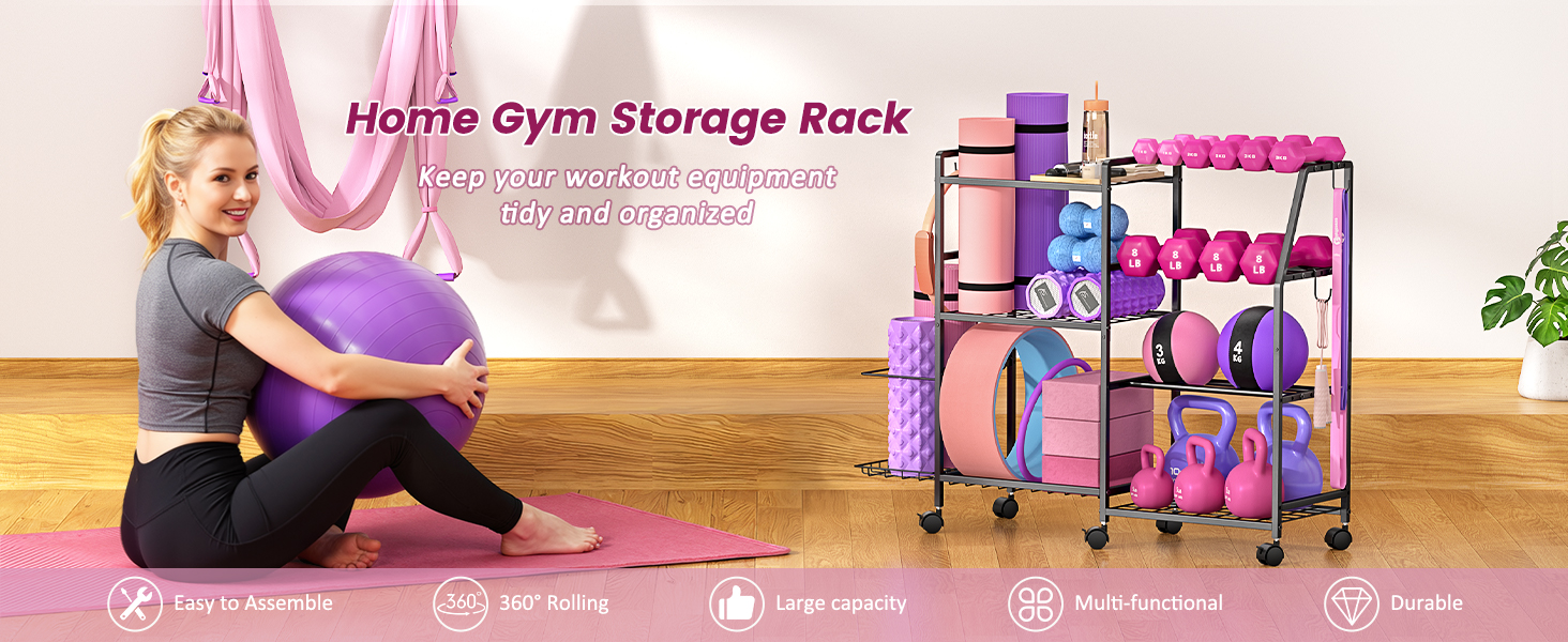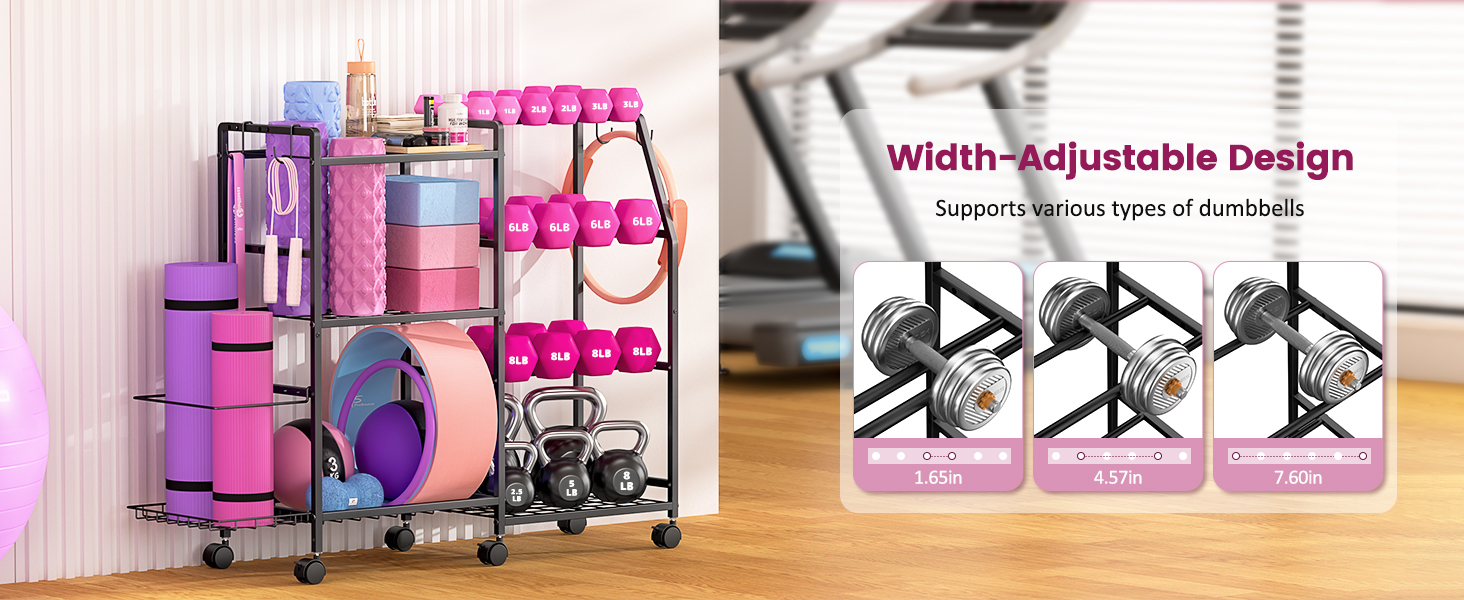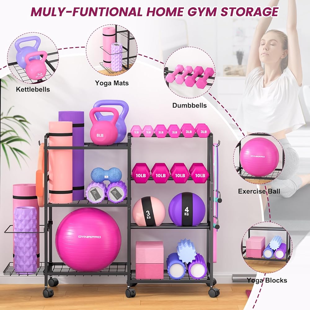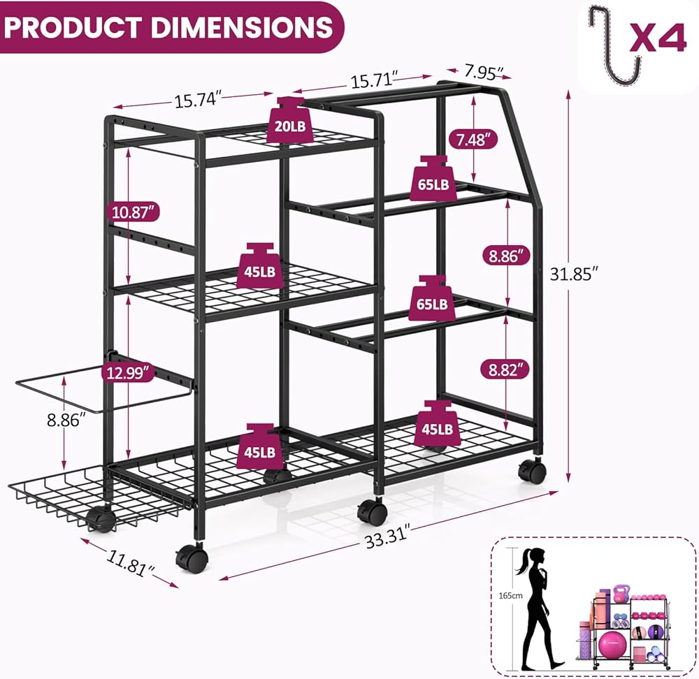 【منظمة تخزين الكل في واحد】يتميز الجانب الأيسر بمساحة علوية لسجادات اليوجا وبكرات الرغوة وأدوات اللياقة البدنية الأخرى، مع رف سفلي مصمم لتخزين الكرات الرياضية. على اليمين، يوفر حامل الدمبل المكون من 3 طبقات مساحة واسعة لمختلف الدمبل، مما يحافظ على نظافة صالة الألعاب الرياضية الخاصة بك وتنظيمها. المستوى السفلي مثالي للأجراس. بالإضافة إلى ذلك، يتضمن الجانب الأيسر مساحة تخزين إضافية لحصائر اليوغا وأربعة خطافات لتعليق العناصر بشكل مريح مثل حبال القفز وأشرطة المقاومة والمناشف - مما يجعل من السهل تنظيم ملحقات اللياقة البدنية التي يصعب تخزينها.