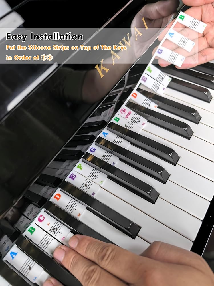 يمكن وضع ملصقات مفاتيح البيانو الخاصة بنا وإزالتها بسرعة حسب الحاجة. عندما تبدأ في معرفة المفاتيح والتعرف على قاعدة الأوكتاف، يمكنك إزالة شرائط النوتة الموسيقية من لوحة المفاتيح.
