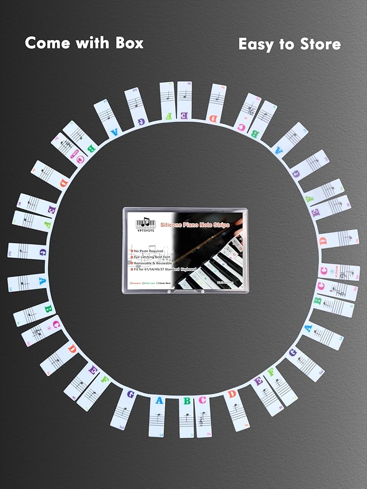 شرائط ملاحظات البيانو YPTSYSYS مصنوعة من السيليكون وتربط الملصقات في سلسلة، ولا حاجة للالتصاق بالمفاتيح مثل ملصقات البيانو. سهل التركيب وسهل الإزالة دون ترك بقايا أو إتلاف مفاتيح البيانو.