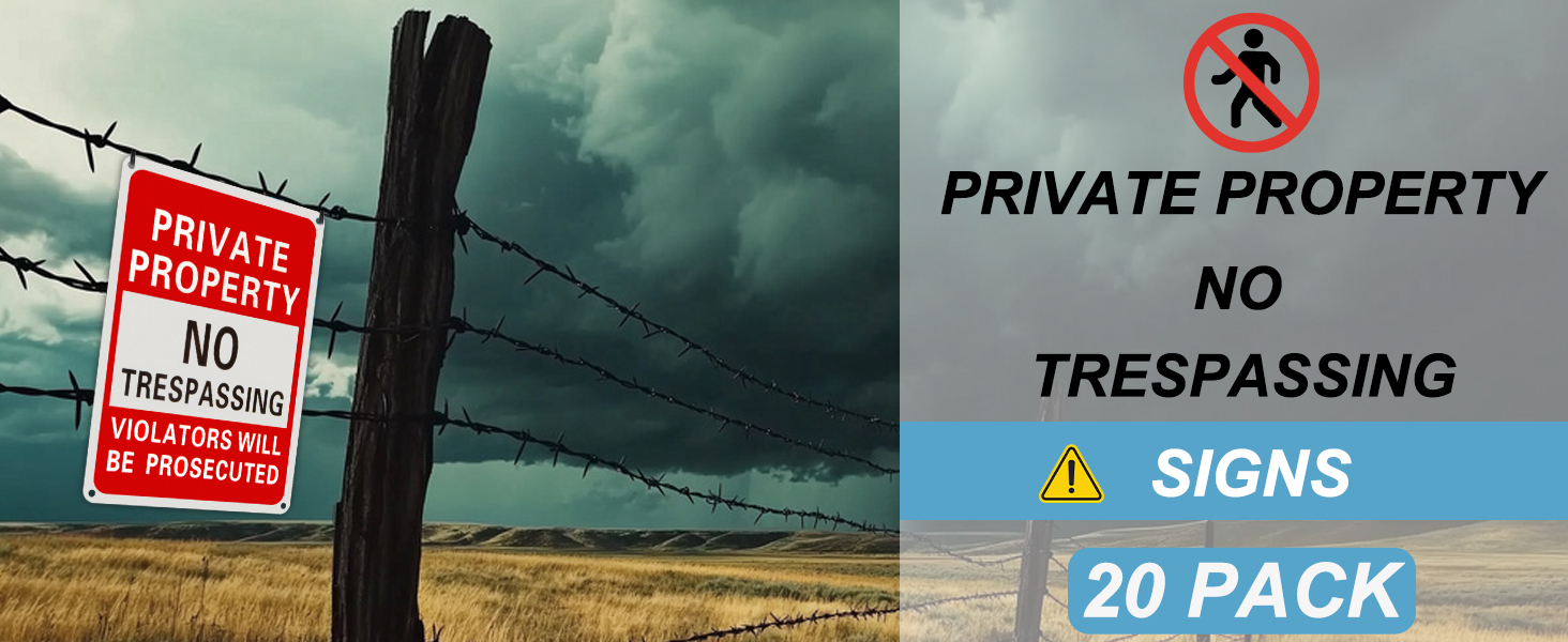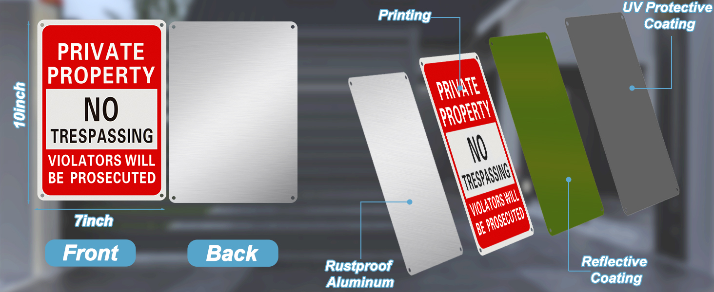لافتات عاكسة: لا تستخدم علامات التعدي على ممتلكات الغير مواد عاكسة عالية الجودة للرؤية في الإضاءة المنخفضة وسوف تنعكس عند إضاءتها بواسطة المصابيح الأمامية أو أي مصدر ضوء آخر. تضمن الحماية العاكسة والأشعة فوق البنفسجية أن تكون اللافتات مرئية للغاية في جميع الظروف الجوية.
