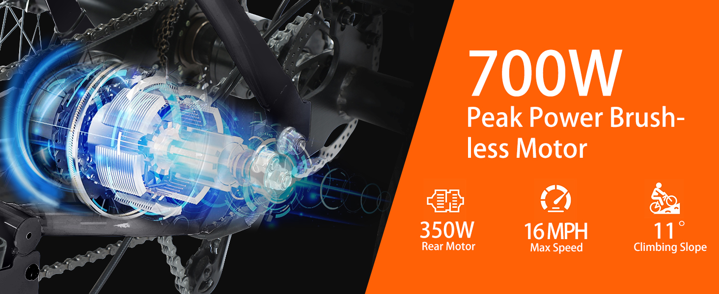 【350W Brushless Motor】Master any terrain with ease thanks to the powerful 350W motor (peak 700W) of the folding electric trike. Designed for superior performance, this rear hub motor features a specially designed transmission system that increases motor output power by 30%, allowing effortless climbing of slopes and smooth navigation through challenging terrains. With a top speed of 16 MPH, it enhances the bike's passability, ensuring an exceptional riding experience every time.