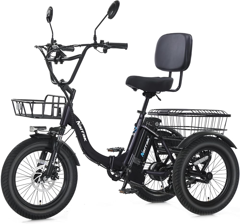 The Narrak electric trike combines power, comfort, and practicality for an exceptional riding experience. It is equipped with a UL2849-certified 48V 13Ah removable battery (624WH) that offers up to 40+ miles of range per charge (50 miles in PAS mode), featuring advanced protection for safety and longevity. The powerful 500W rear hub motor (peak 1300W) is enhanced by a special transmission system that boosts output by 30%, enabling effortless climbing and confident handling of varied terrains at speeds up to 20 MPH. Riders can choose from three modes—e-trike, assisted, or normal trike—and utilize the Shimano 7-speed gearing for flexible electric assist or fitness-focused manual pedaling, supported by two large detachable cargo baskets. Designed for stability and comfort, it features an ergonomic extended frame, wide Cruiser handlebars, and 18″ x 3.0 fat tires with a differential system to ensure stable turning. The extra-wide adjustable seat is made with high-resilience memory foam and a built-in backrest, folds 90° for easy charging access, and accommodates riders from 4‘8″ to 5‘8″ with a weight capacity of 298 lbs. Assembly is quick with 95% pre-assembly, and expert U.S.-based support is available at 626-328-6000.