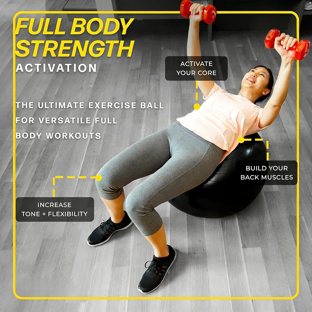 كرة التمرين - كرة اليوجا مضادة للانفجار ومقاومة للانزلاق، للياقة البدنية، والحمل، والثبات، والتوازن، والتمارين الأساسية - كرة تدريب مع مضخة سريعة - المكتب، المنزل، صالة الألعاب الرياضية
