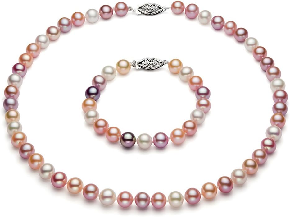 تتضمن هذه المجموعة الرائعة من لآلئ المياه العذبة متعددة الألوان قلادة وسوار مطابق. هذه المجموعة مصنوعة من اللؤلؤ الوردي اللامع والأبيض والخوخي واللافندر المستزرع في المياه العذبة. يبلغ طول القلادة 17 انش والسوار 7 انش. يتم عقدها بين كل لؤلؤة مستزرعة ولمسة نهائية بمشبك جميل من الفضة الإسترلينية. هذه اللآلئ المستزرعة ذات جودة ايه ايه +، مع بريق جيد وسطح أملس. هذه المجوهرات مصنوعة يدويًا من قبل صانعي المجوهرات المهرة لدينا في الولايات المتحدة الأمريكية ويتم مراقبة الجودة بدقة من قبل خبراء اللؤلؤ المستثمرين لدينا. تأتي مع صندوق مجوهرات عالي الجودة وشهادة أصالة.