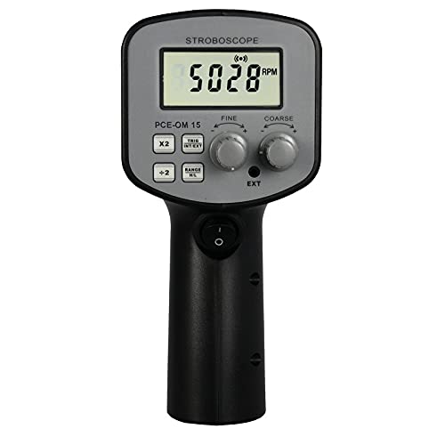 The PCE-OM 15 Stroboscope from PCE Instruments is a professional-grade handheld strobe tachometer designed for precision measurement and visual inspection of moving objects. This portable digital stroboscope features an intuitive trigger functionality for easy operation in industrial environments. With high/low range selection and push-button rate control, you can easily scale the flash rate slower () or faster (×2) to match your specific inspection needs. The device includes both coarse and fine adjustment knobs for precise control of the flash rate. When properly synchronized with moving machinery, the stroboscope creates the visual effect of freezing motion, allowing for detailed inspection without stopping production. With slight adjustments, you can observe movement in apparent slow motion, making it easier to detect irregularities, vibrations, or defects in rotating equipment. The compact design measures just 8.5" × 3.4" × 7.1" and weighs only 2.2 pounds, making it ideal for maintenance technicians who need to move between different inspection points. Backed by a 2-year warranty, this measurement tool delivers reliable performance for industrial maintenance and quality control applications.