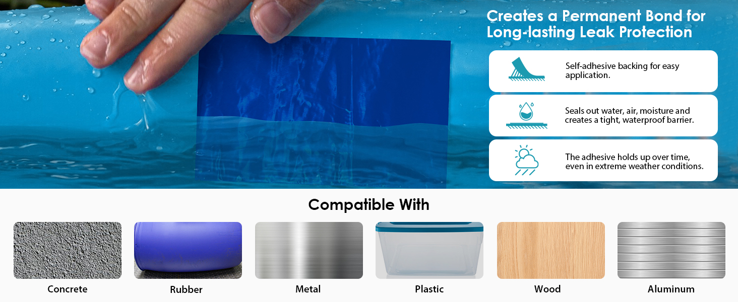متوافق مع العديد من الأسطح: يرتبط شريط إصلاح تسرب حمام السباحة هذا بقوة بالزجاج والأسقف المطاطية والأسقف المعدنية والخرسانة والبلاط والفولاذ المجلفن والألمنيوم والخشب والبلاستيك والطوب والمزيد. إنه مثالي لإغلاق التسريبات وترقيع الأسطح وإصلاحات التسريبات المنزلية في حالات الطوارئ. خيار يمكن الاعتماد عليه لكل من أصحاب الأعمال اليدوية ومالكي المنازل والمحترفين