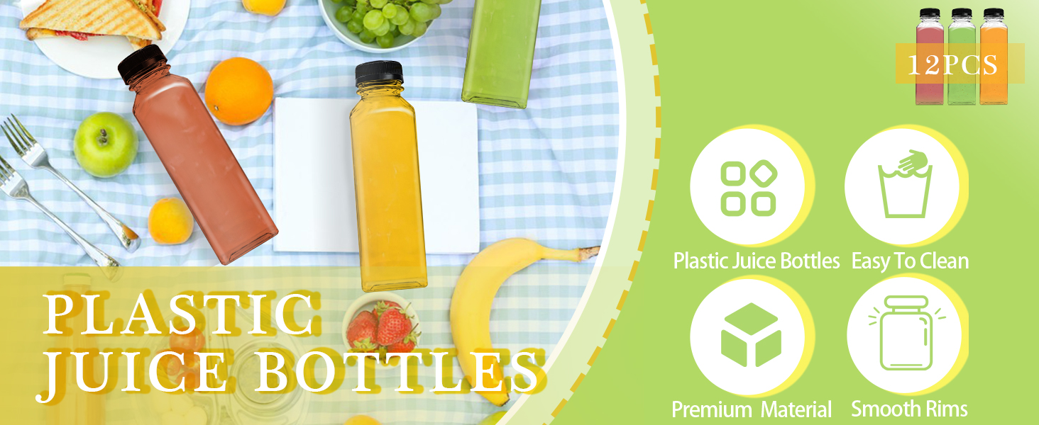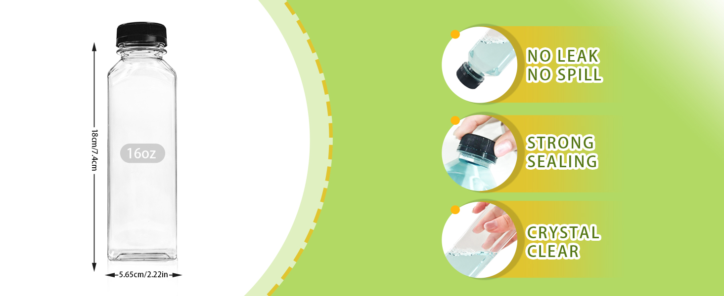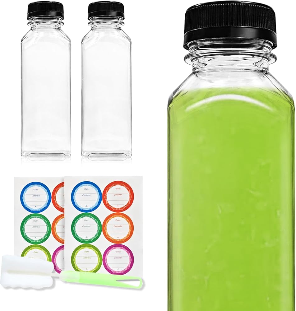 تتضمن العبوة: تحتوي كل مجموعة على 12 قطعة من زجاجات العصير البلاستيكية سعة 16 أونصة مع أغطية، و12 ملصقًا دائريًا ملونًا مكتوبًا عليه التاريخ والمحتويات، وفرشاة لسهولة التنظيف، وقمع سيليكون لتوزيع السوائل. مقاسات زجاجات العصير البلاستيكية الشفافة هي 1.5 قطر عند الفم و 7.4 ارتفاع و 2.22 قطر في الأسفل