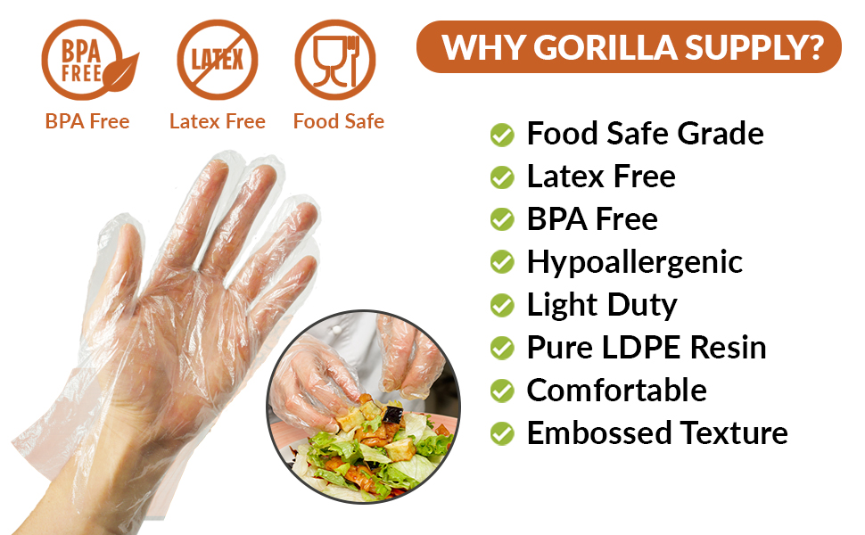 قفازات GORILLA SUPPLY 500 خالية من مادة BPA للاستعمال مرة واحدة من بلاستيك بولي PE LDPE للمطبخ والتعامل مع الطعام وإعداد الطعام وخالية من اللاتكس والبودرة (500 قطعة، كبيرة) in Kuwait