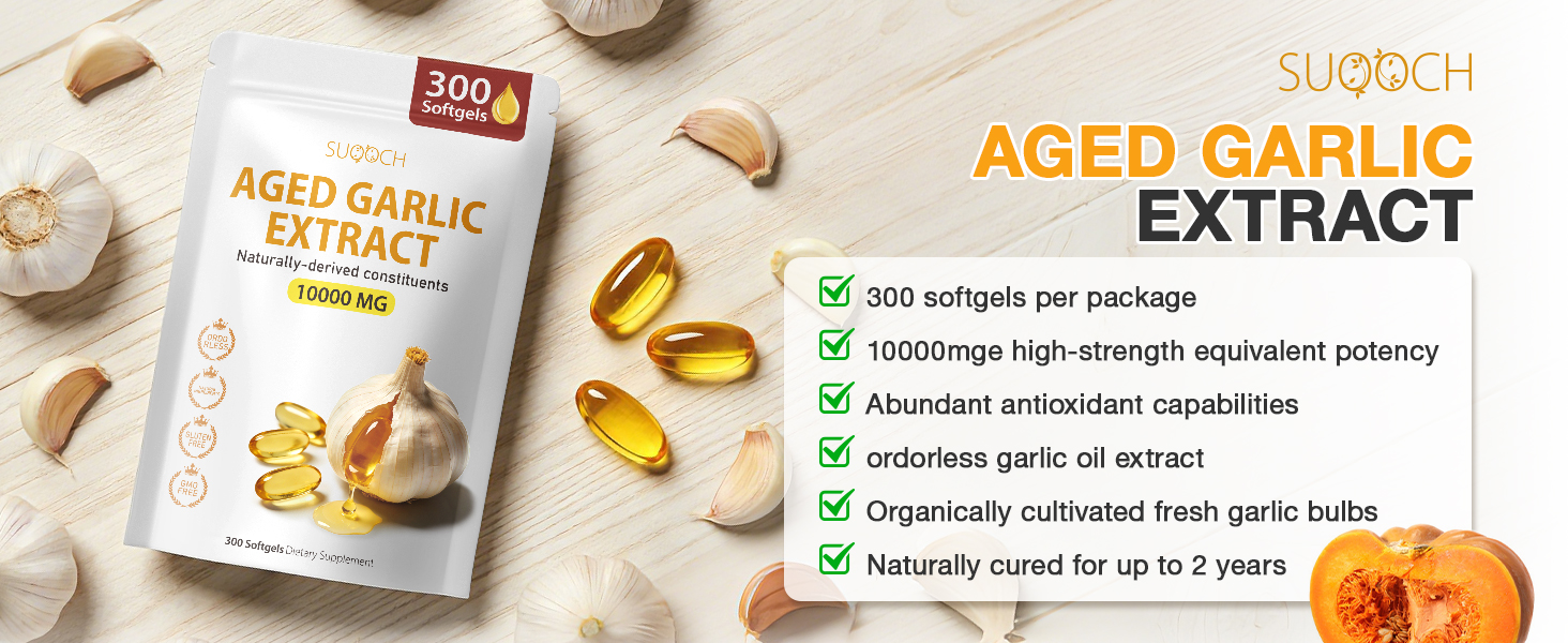 مستخلص الثوم المسن - 300 عدد 10000 مجم من مكملات الثوم المسنة للصحة اليومية وروتين صحة القلب والأوعية الدموية، غير معدلة وراثيًا، كبسولات هلامية طبيعية بالكامل، عافية مضادة للسموم النقية