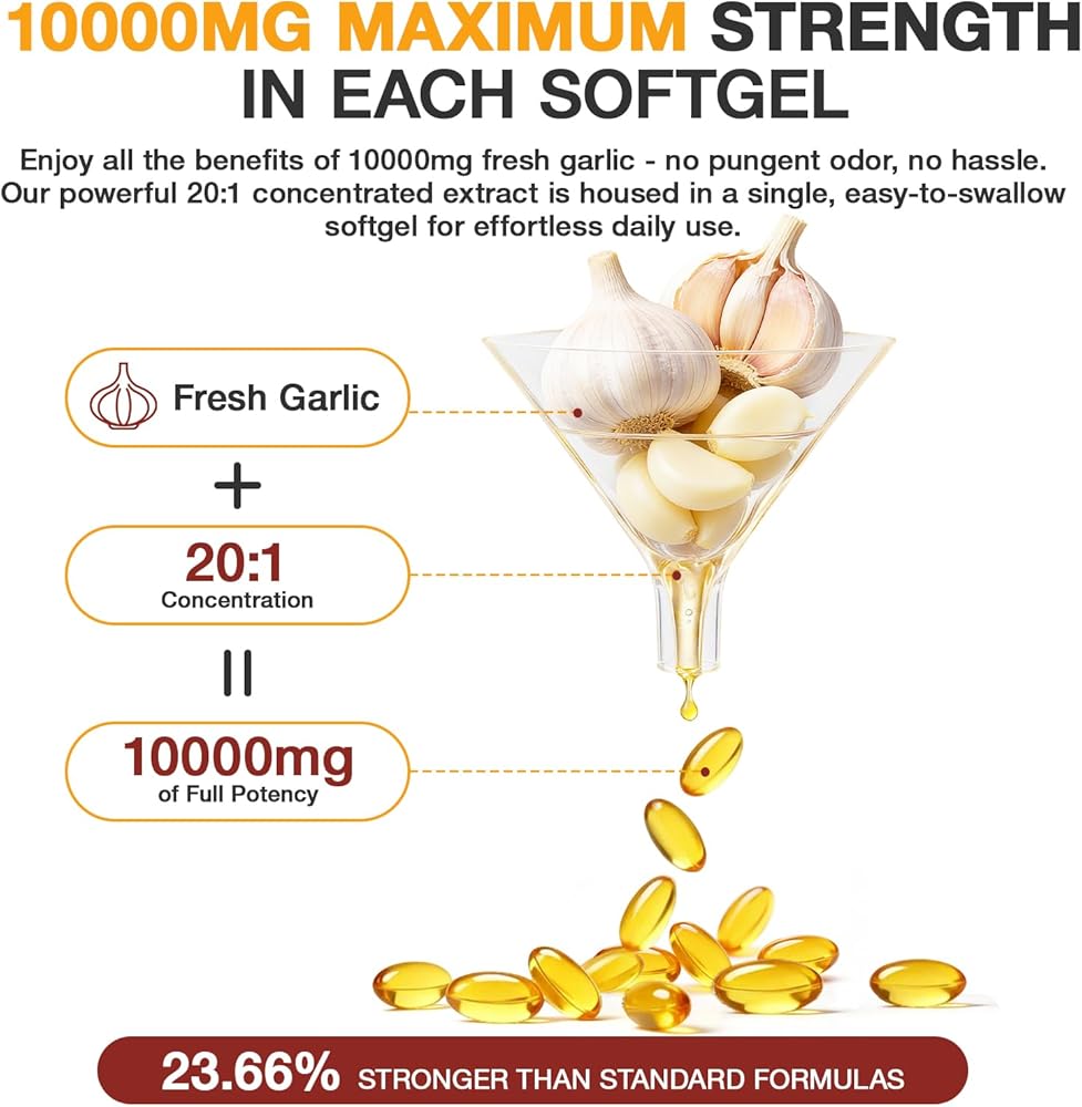 • [فعالية عالية في 2 كبسولة هلامية: ما يعادل 10,000 مجم] تحتوي كل جرعة من 2 كبسولة هلامية على ما يعادل 20:1 مركزًا من 10,000 مجم من مستخلص بصلة الثوم المعتقة، الناضجة بعناية لتعزيز ثبات المكونات، والاحتفاظ بالمغذيات، والامتصاص.