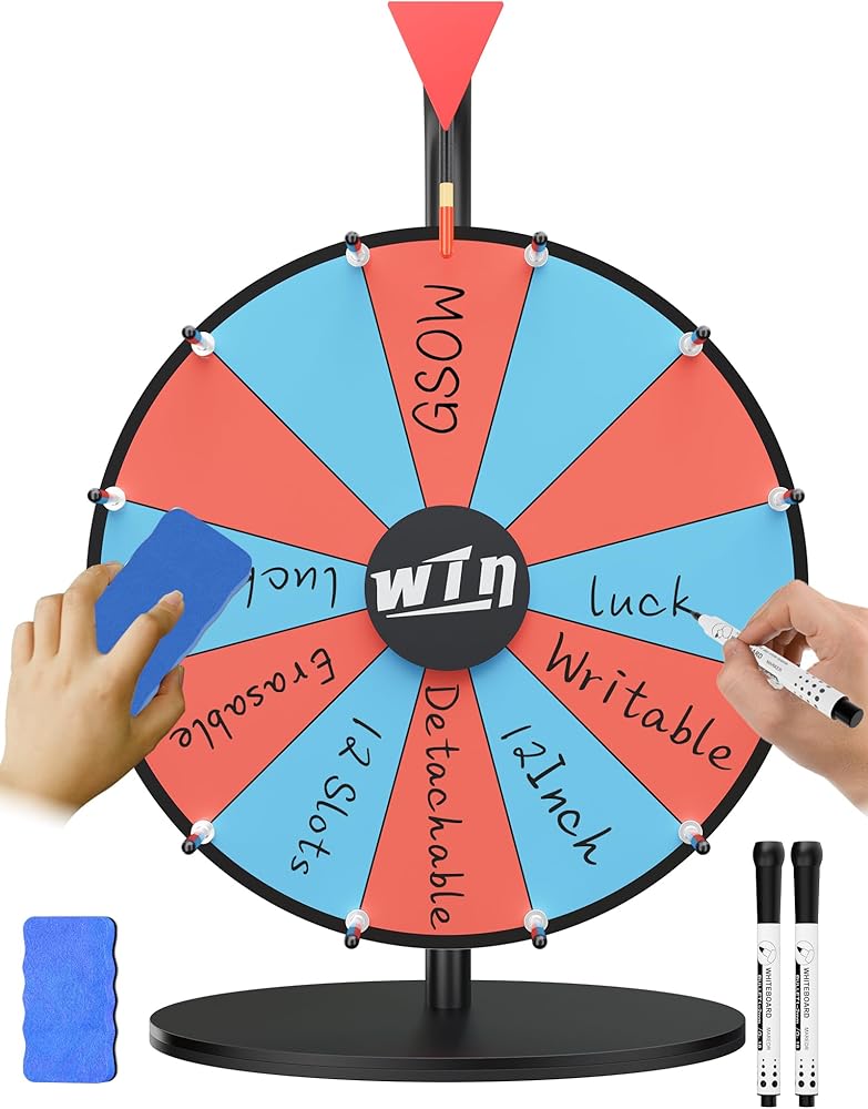 • 𝐃𝐫𝐲 𝐄𝐫𝐚𝐬𝐞 - عجلة الجائزة الدوارة مقاس 12 بوصة مع الحامل تتميز بـ 12 فتحة ألوان متدرجة على اللوحة المستديرة، وتأتي مع قلمين وممحاة. يمكنك تخصيص الجوائز أو الجوائز وفقًا لاحتياجاتك، مثالية للمنزل والعمل! أعد استخدامها عدة مرات