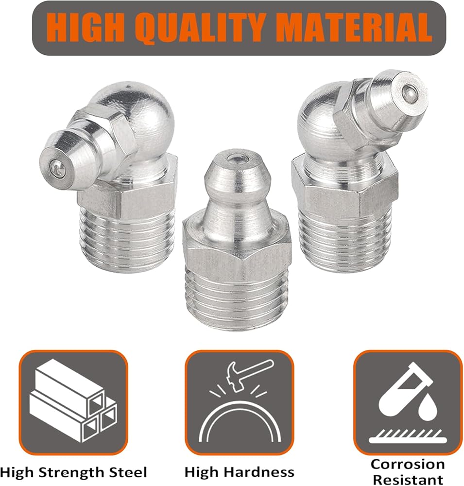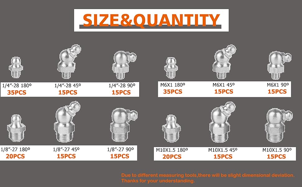بما في ذلك: أداتان متعددتان، 100 قطعة من الأغطية البلاستيكية و230 قطعة من zerk SAE واستبدال تركيبات الشحوم المترية. أداة واحدة تناسب تركيبات زرك الشحوم 1/8"-NPT PTF، وتركيبات M10x1 وGrease Zerk بحجم سداسي 3/8 بوصة (9.5 مم) و7/16 بوصة (11 مم). واحدة تناسب تركيبات 1/4 بوصة - 28 SAE وM8x1 وZerk ذات الحجم السداسي 5/16 بوصة (7.85 مم) و3/8 بوصة (9.5 مم)