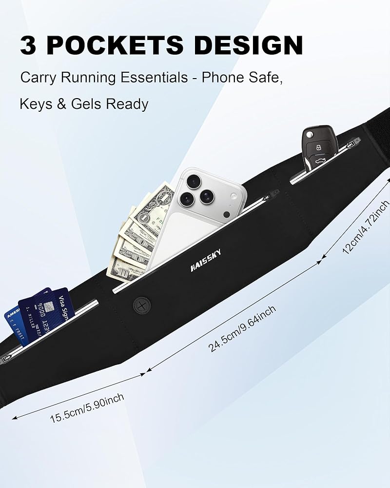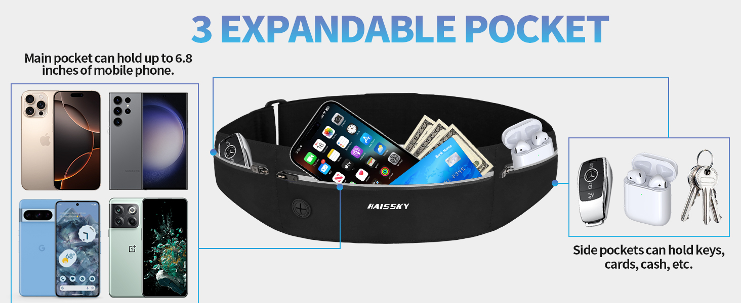 حزام الجري بتصميم ثلاثي الجيوب: يتميز حزام الجري هذا بثلاثة جيوب مستقلة للتنظيم. المقصورة الرئيسية الواسعة تناسب معظم الهواتف الذكية حتى 6.8 بوصة. تتيح لك الجيوب الجانبية اليسرى واليمنى فصل سماعات الأذن والبطاقات والنقود والمواد الهلامية للطاقة والأنسجة والمفاتيح للوصول السريع مع منع خدوش الشاشة. منفذ سماعة الرأس المدمج يدعم سماعات الأذن السلكية