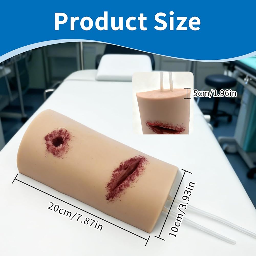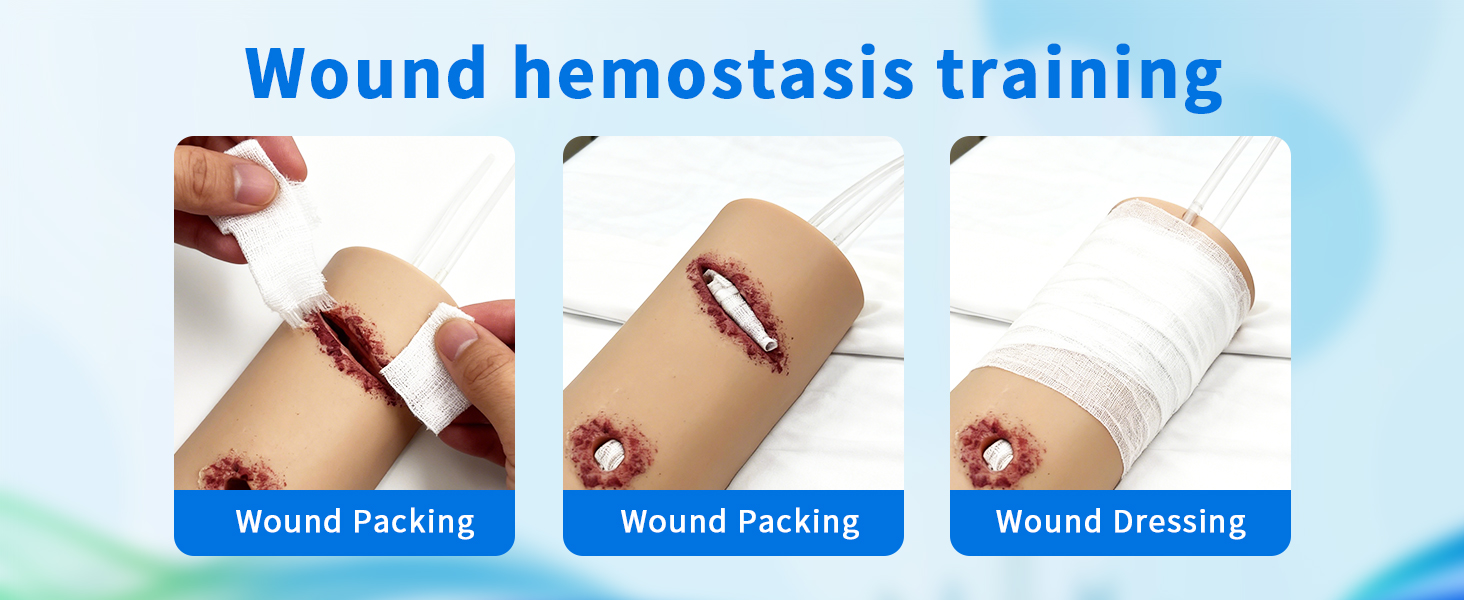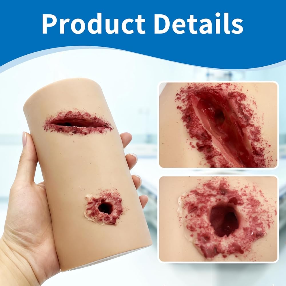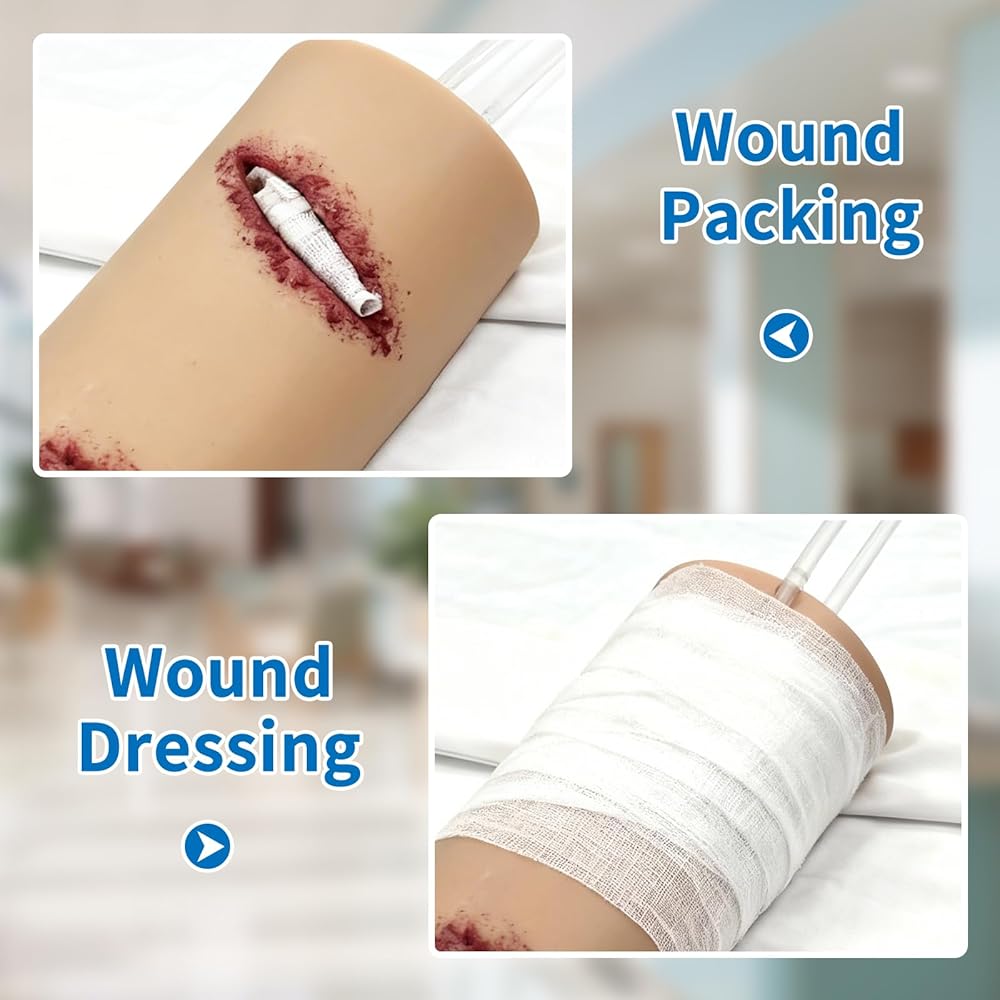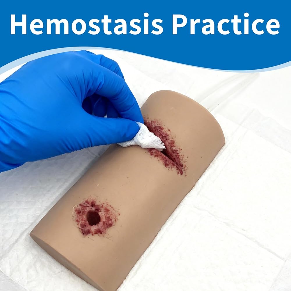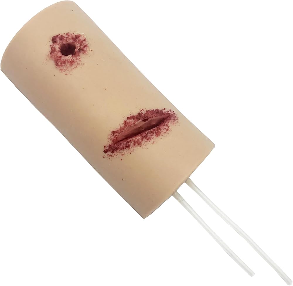 ➤ نموذج محاكاة الجروح: النموذج عبارة عن تمزق واقعي وجرح رصاصة وجروح طعنة في الفخذ. يدعم النموذج التدريب على استخدام الضمادات والعاصبة (غير متضمنة في العبوة). يمكن استخدامه كمدرب جاف أو مصبوب بمحاكاة الدم لتجربة تدريب واقعية.