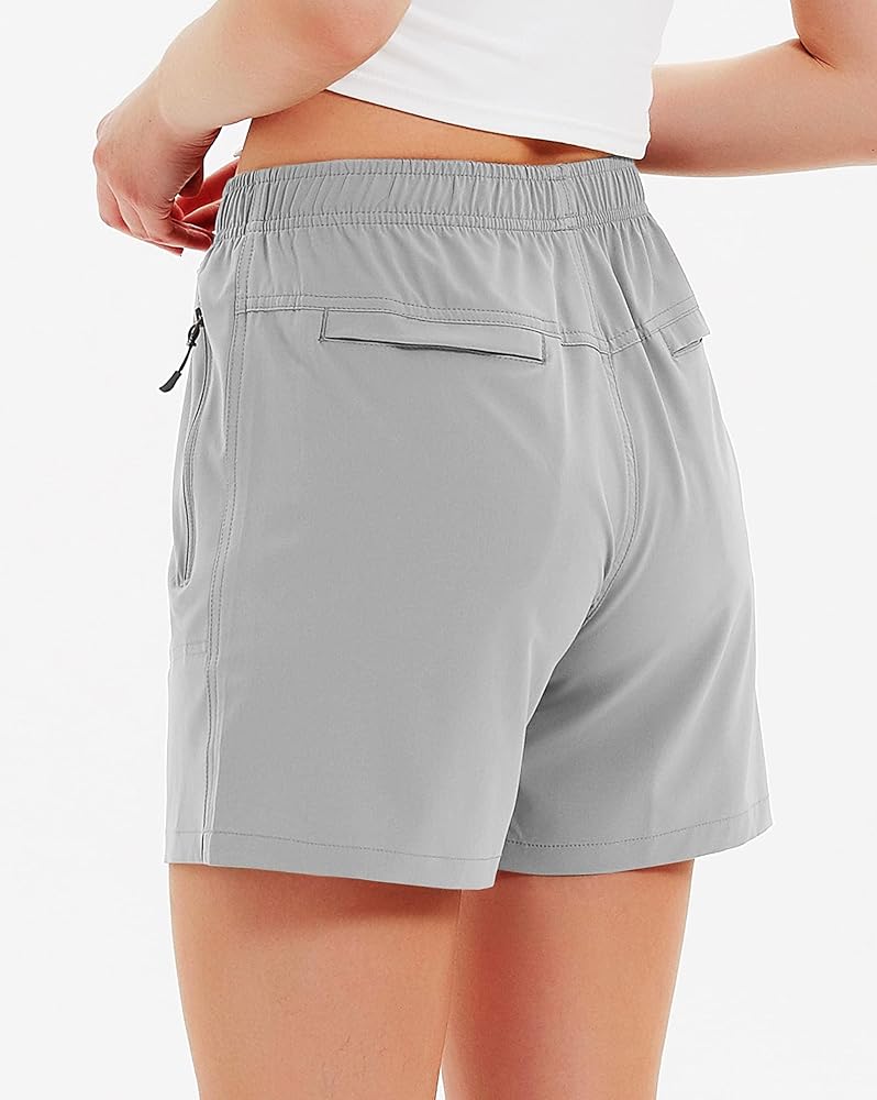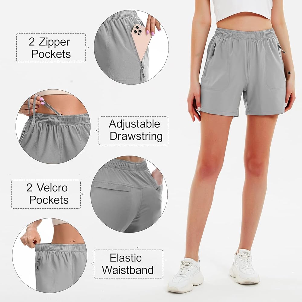 شورت نسائي لرياضة المشي لمسافات طويلة 5 بوصات سريع الجفاف رياضي خفيف الوزن في الهواء الطلق للتمرين مع جيوب بسحاب رمادي فاتح S